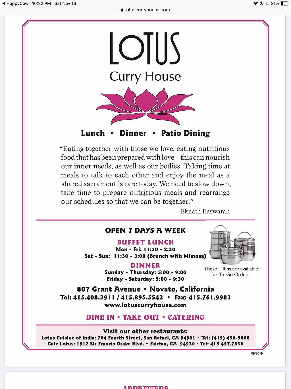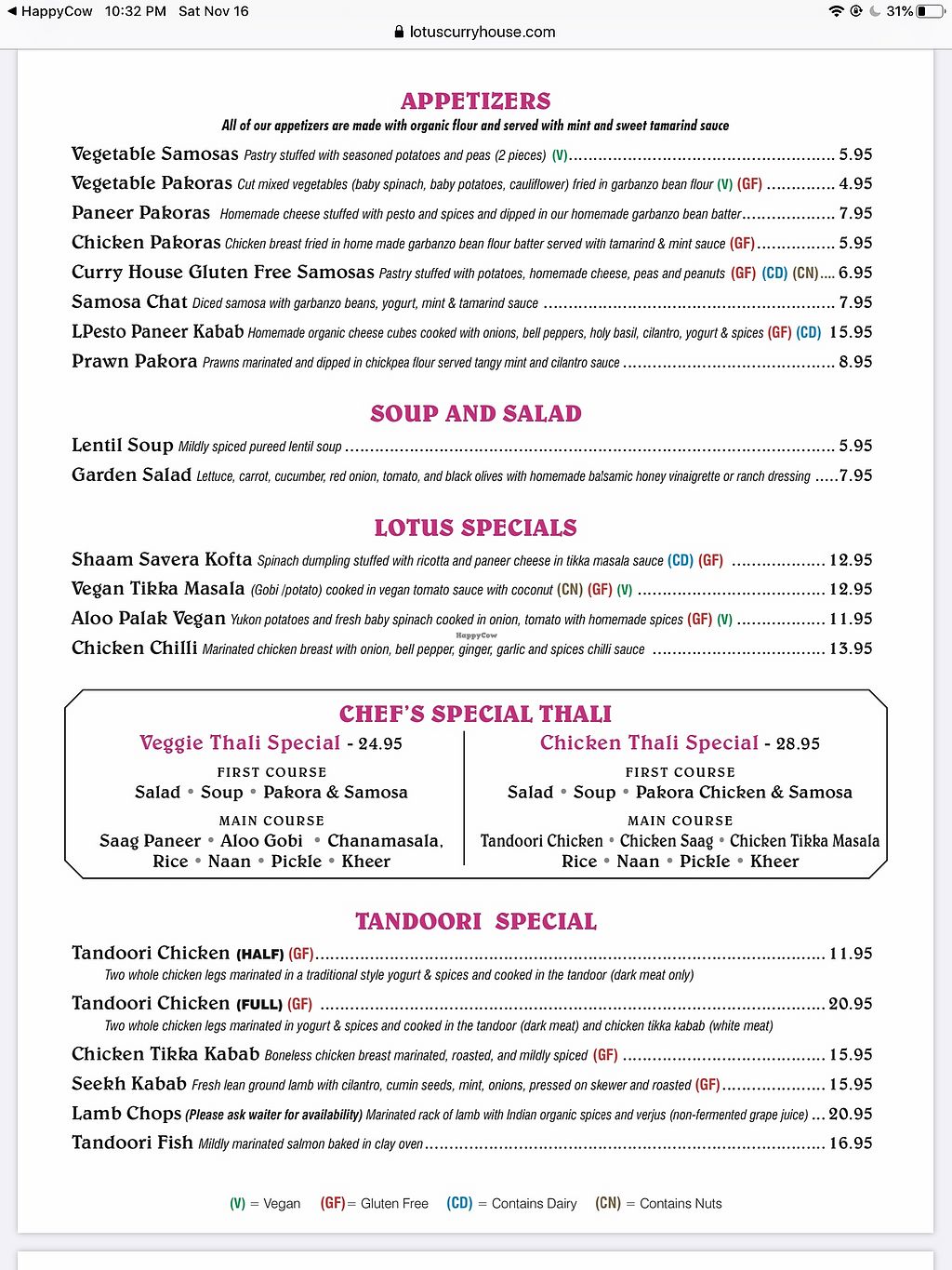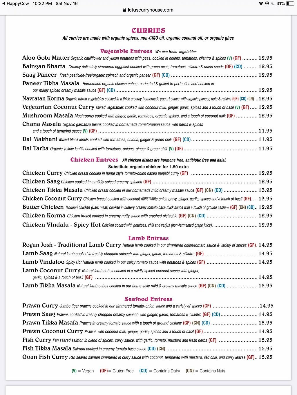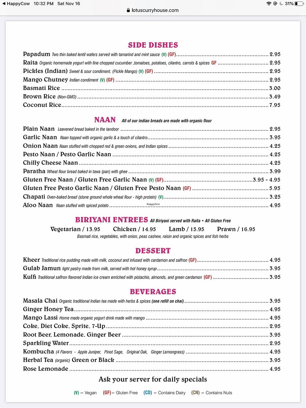 The menu marks all vegan options. This is my favorite Lotus! They are very accommodating & even made saag tofu that was off menu & made me chai with coconut milk 💖💖