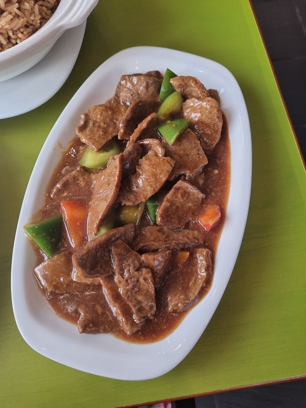 "Beef" satay, double fried rice portion and "beef"/mushroom in black b…