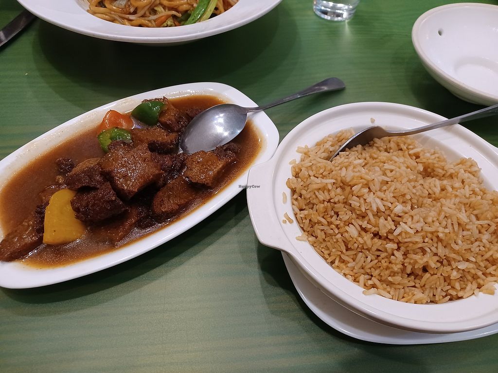 Fried rice with vegan chicken curry and vegan beef and black bean sauc…