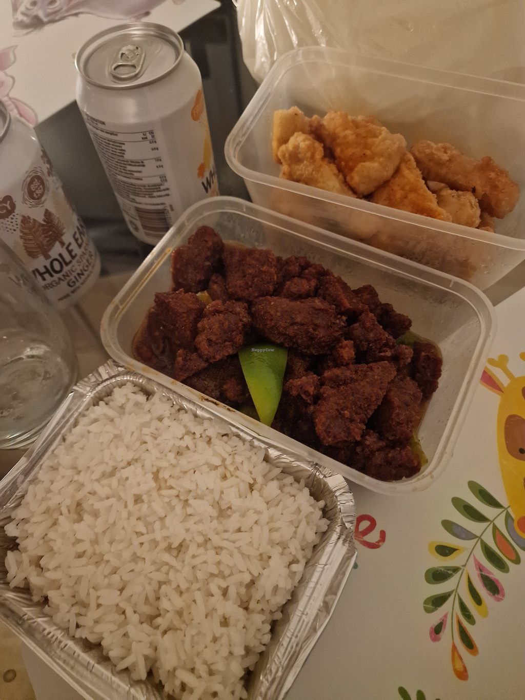 Bbq seitan, kung po soya balls, rice, chips