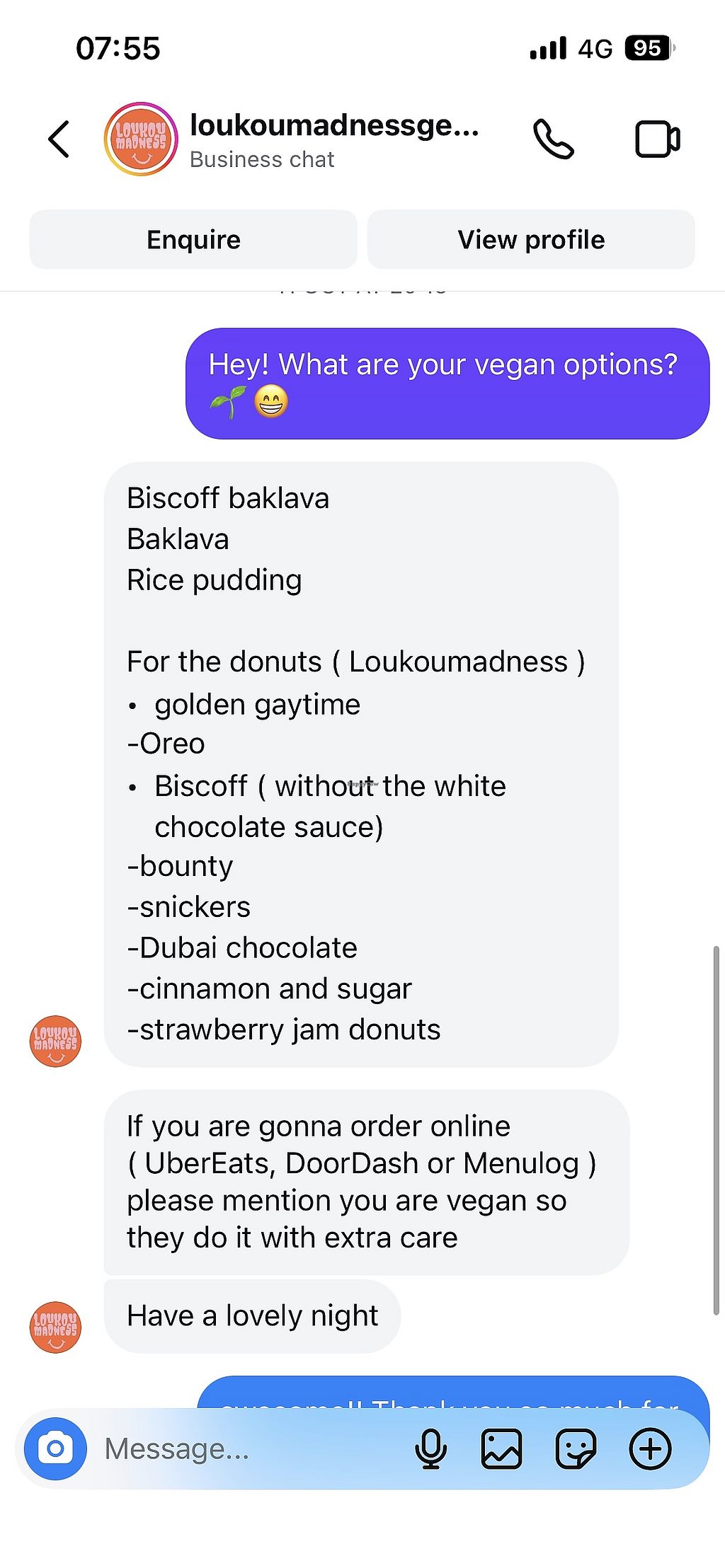 Greek dessert shop offering vegan options like baklava, "Biscoff baklava" (baklava with spiced biscuit spread), and rice pudding. Loukoumades (Greek fried dough balls) – vegan flavours include "Golden Gaytime" (caramel biscuit crumb topping), "Oreo" (crushed chocolate sandwich cookies), and "Biscoff" (spiced biscuit spread, no white chocolate sauce). Open Mon-Wed 5:30pm-9:30pm, Thu-Fri 5:00pm-10:00pm, Sat 11:30am-10:00pm, Sun 11:30am-3:30pm.