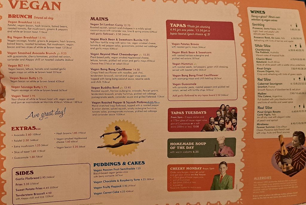 Serves meat, vegan options available. UK chain of cafe-bars offering a separate vegan menu upon request. Example vegan dishes include a vegan breakfast, jackfruit burger, falafel wrap, various salads and tapas. Also offers vegan meals for children as well as treats for dogs. Open Mon-Wed 09:00-23:00, Thu-Sat 09:00-00:00, Sun 09:00-23:00.