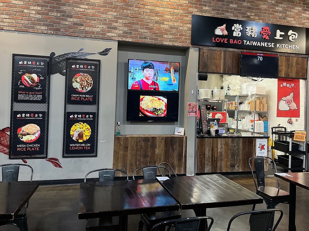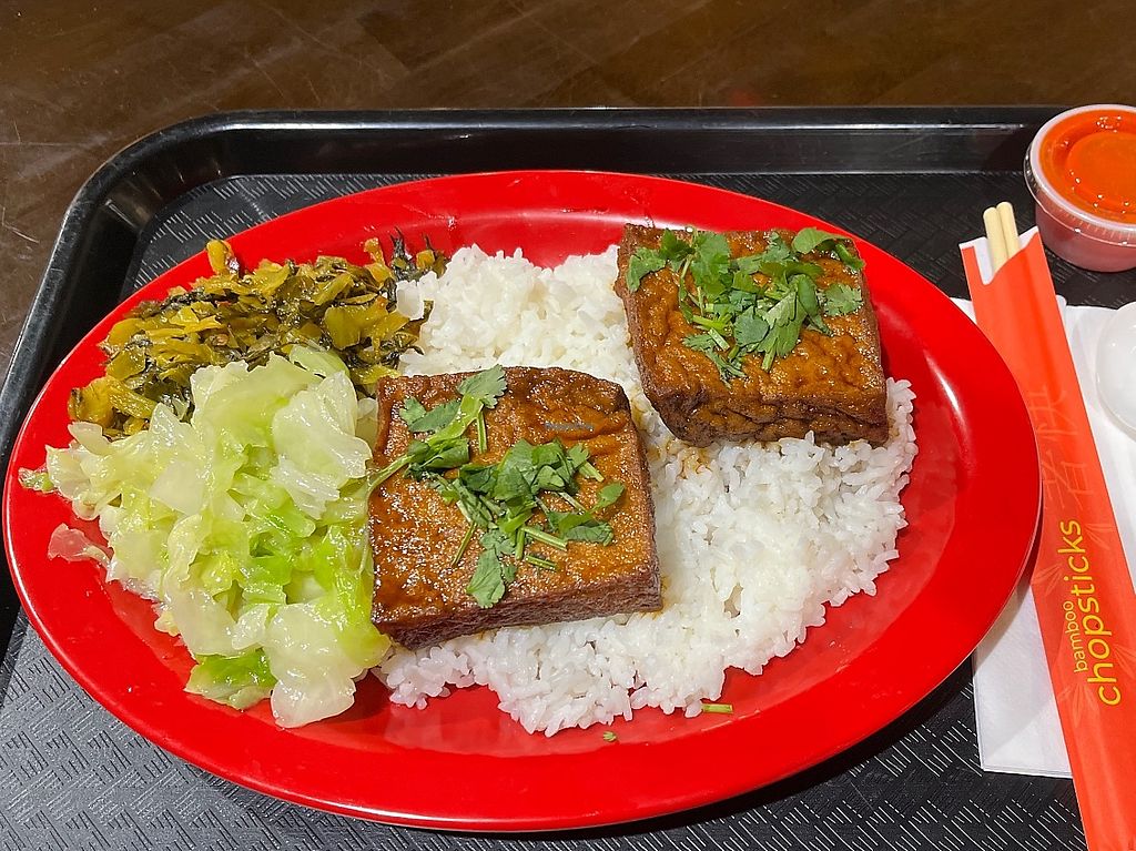 Serves meat, vegan options available. Fast-casual Taiwanese food court restaurant with vegan choices. Menu includes rice plates, buns and noodles with vegan soy steak, konjac pork belly and tofu protein option. Open Mon-Sun 10:30am-8:00pm.