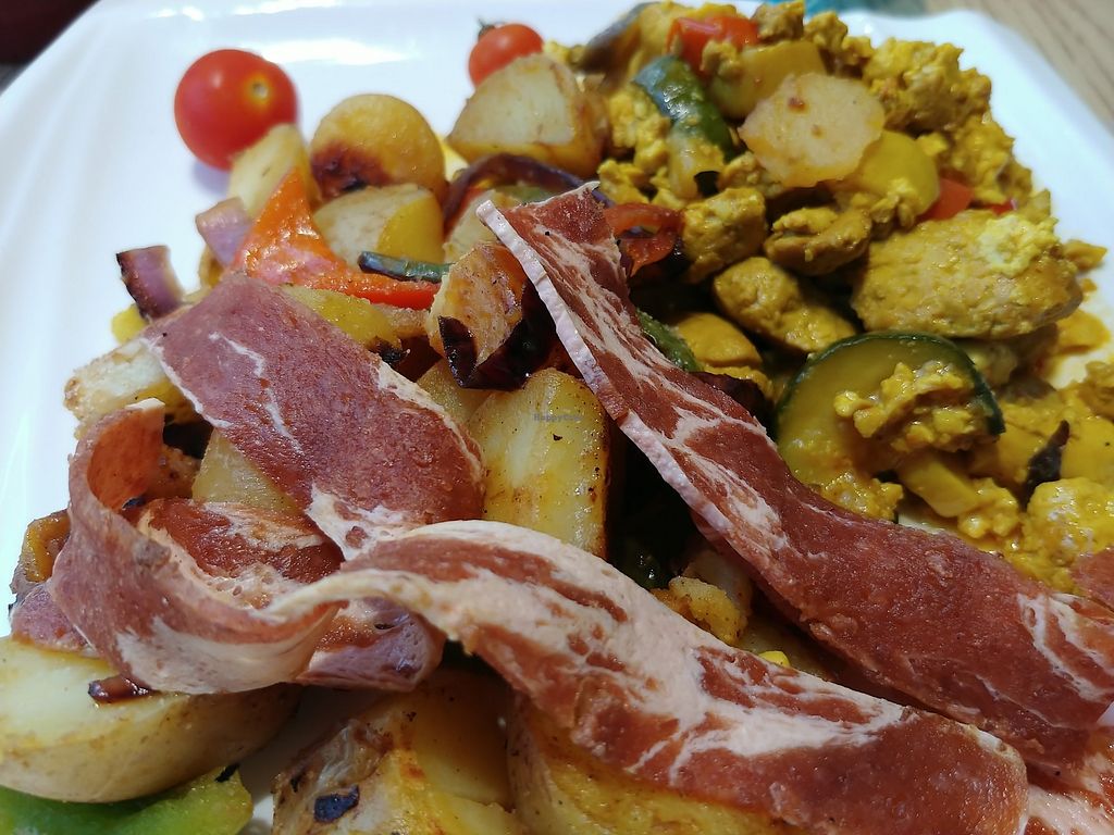 Tofu scramble: the scramble seasoning tasted like mustard and tumeric, not very good. The potatoes were okay but mainly oil and salt. The bacon was very good.