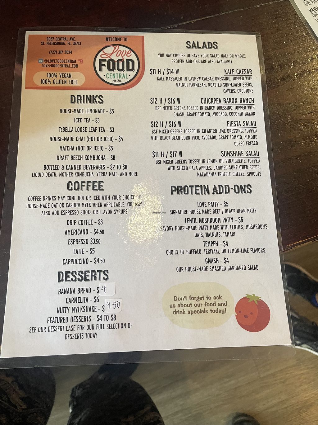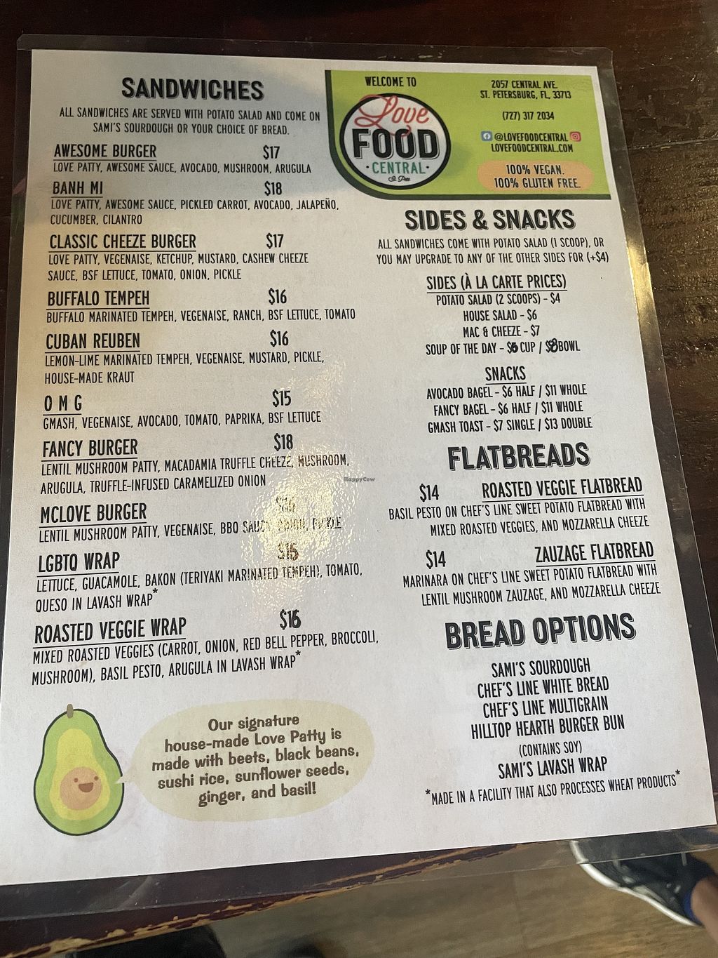 We tried Love Food Central for the first time this morning and it was a hit. We started with the Broccoli Cheezy Soup and it was so good! My husband said it reminded him of the broccoli cheese soup I used to make before I chose to be vegan. We then shared 2 sandwiches: The Reuben and the Love Burger. Both were so good! Although it was not served on rye bread (which is traditionally how a Reuben is served), it was still a very delicious tempeh sandwich and I would highly recommend it. The Love Burger was also delicious and full of flavor. We are so happy we chose this place for lunch. Staff was very friendly. We drove up from Sarasota and we will be back next time we are in town.