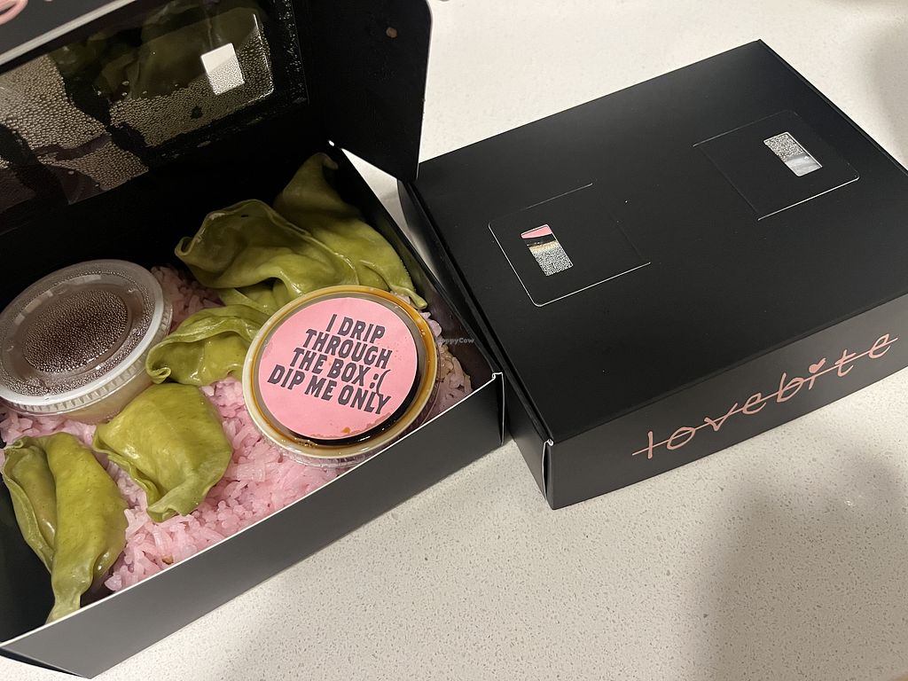 Veggie dumplings on greens and pink rice, topped with fried onions