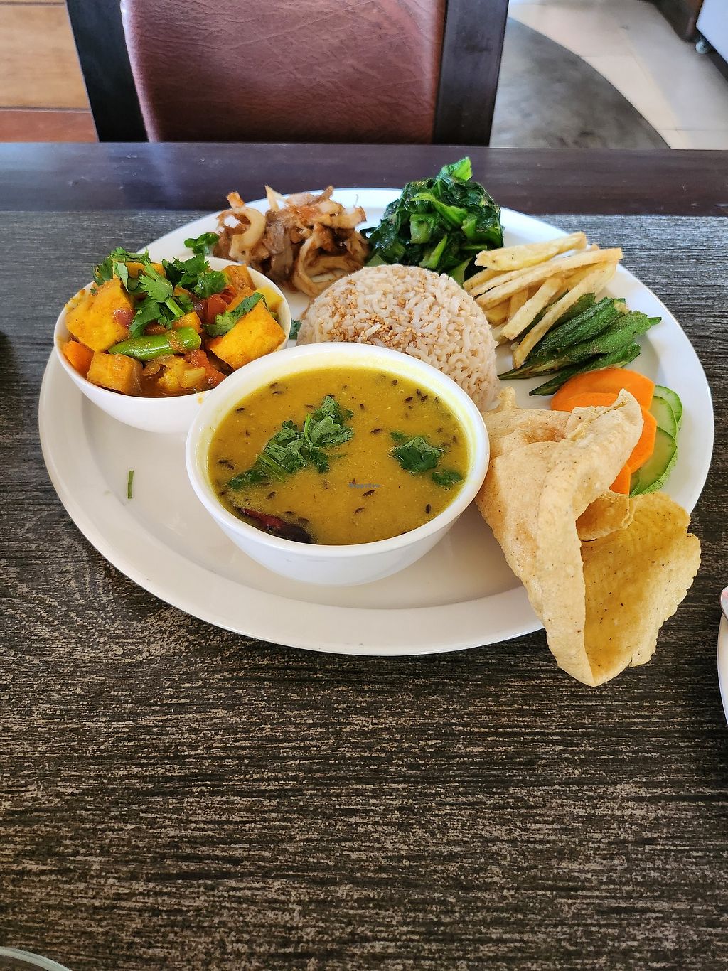 This is the oldest vegan restaurant in Nepal, they really respect animals here. I was made very welcome and asked if I wanted extra rice during my meal. It felt like a family meal. I had the brown rice khana, this is a Nepali Thali meal - accompanied by lentil soup (dal), vegetable curries (tarkari), pickles (achar), and a fish alternative, which was mushrooms. I really enjoyed eating a vegan version of a traditional dish. The portion was generous and the food was tasty 🙏