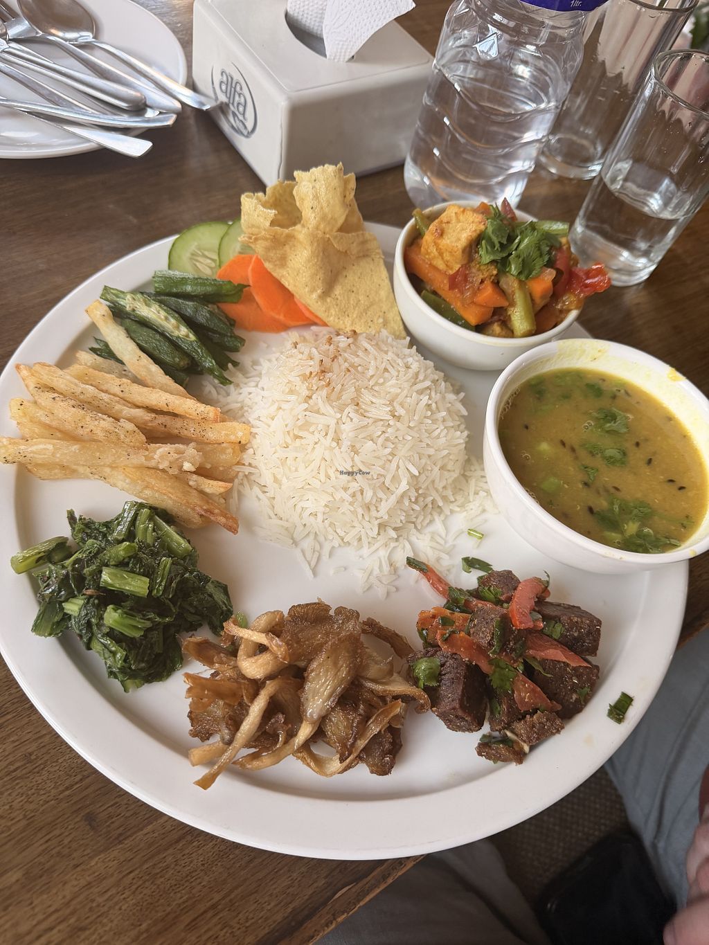 This is the oldest vegan restaurant in Nepal, they really respect animals here. I was made very welcome and asked if I wanted extra rice during my meal. It felt like a family meal. I had the brown rice khana, this is a Nepali Thali meal - accompanied by lentil soup (dal), vegetable curries (tarkari), pickles (achar), and a fish alternative, which was mushrooms. I really enjoyed eating a vegan version of a traditional dish. The portion was generous and the food was tasty 🙏