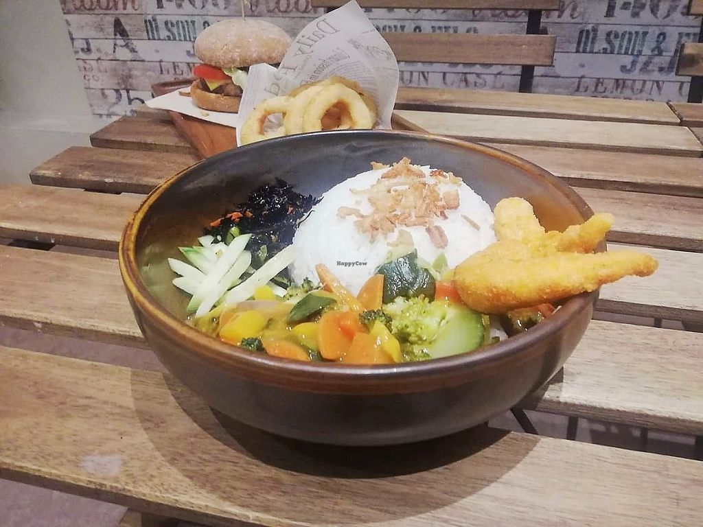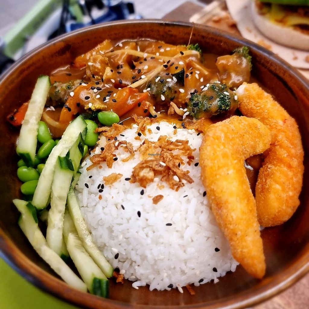 Curry et scampis (curry sauce vegetables and fried vegan shrimps)