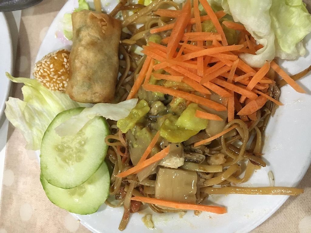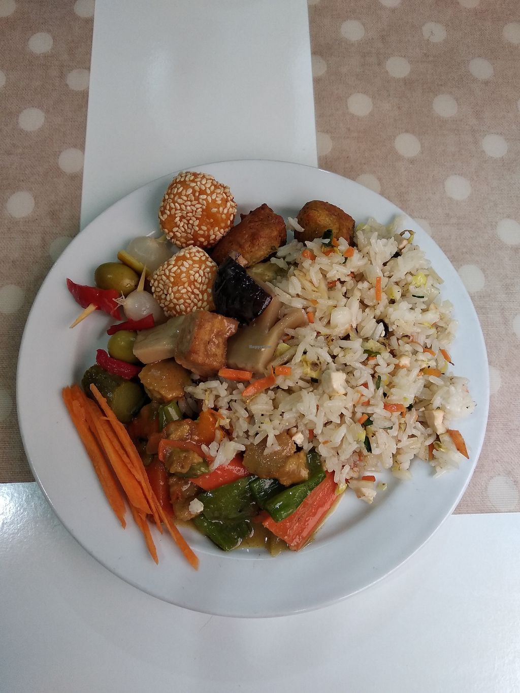 Fried noodles, rice, tofu, fried vegetables, eggplant fritters