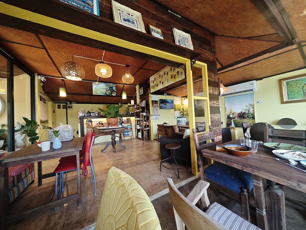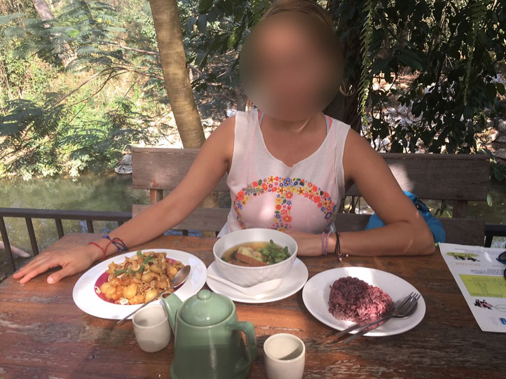 Relaxing location by a river and with a nice view of a mountain. Quiet, despite not not being far from the main road. However, I didn't find the staff welcoming at all, in fact I felt like I was intruding. The menu was disappointing in my view - as it is part of an international chain I was expecting a more diverse menu, but it was more like a glorified "jey" restaurant with thai dishes using fake fish and chicken. The portions were also on the small side. They also said they had no coffee, despite it being on the menu. The so called "shop" had about 2 bags of rice crackers in it and that was it. Overall, if you are in the area I'd recommend "Aurra Ammie Veggie" instead as they are friendlier and have both Thai and Western options.