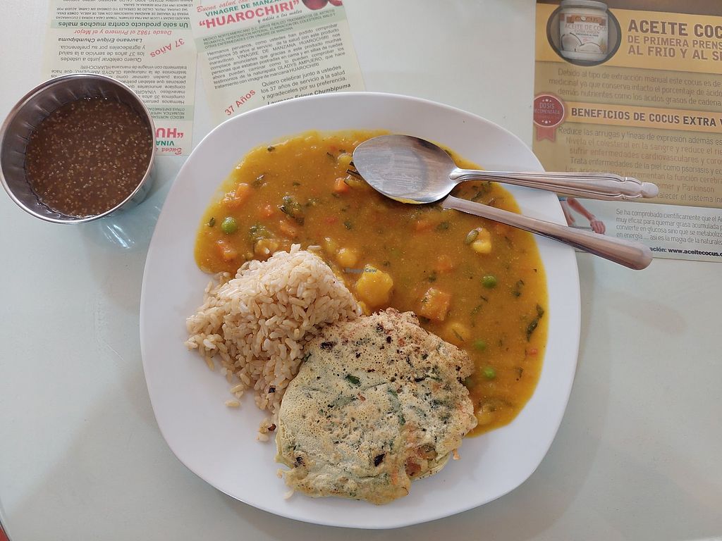 El menú del día incluye bufete de ensalada, sopa del día, plato principal, postre y bebida (refresco natural o infusión). El menú son 20 soles (5€). Además puedes comprar panes, galletas… y otros productos.