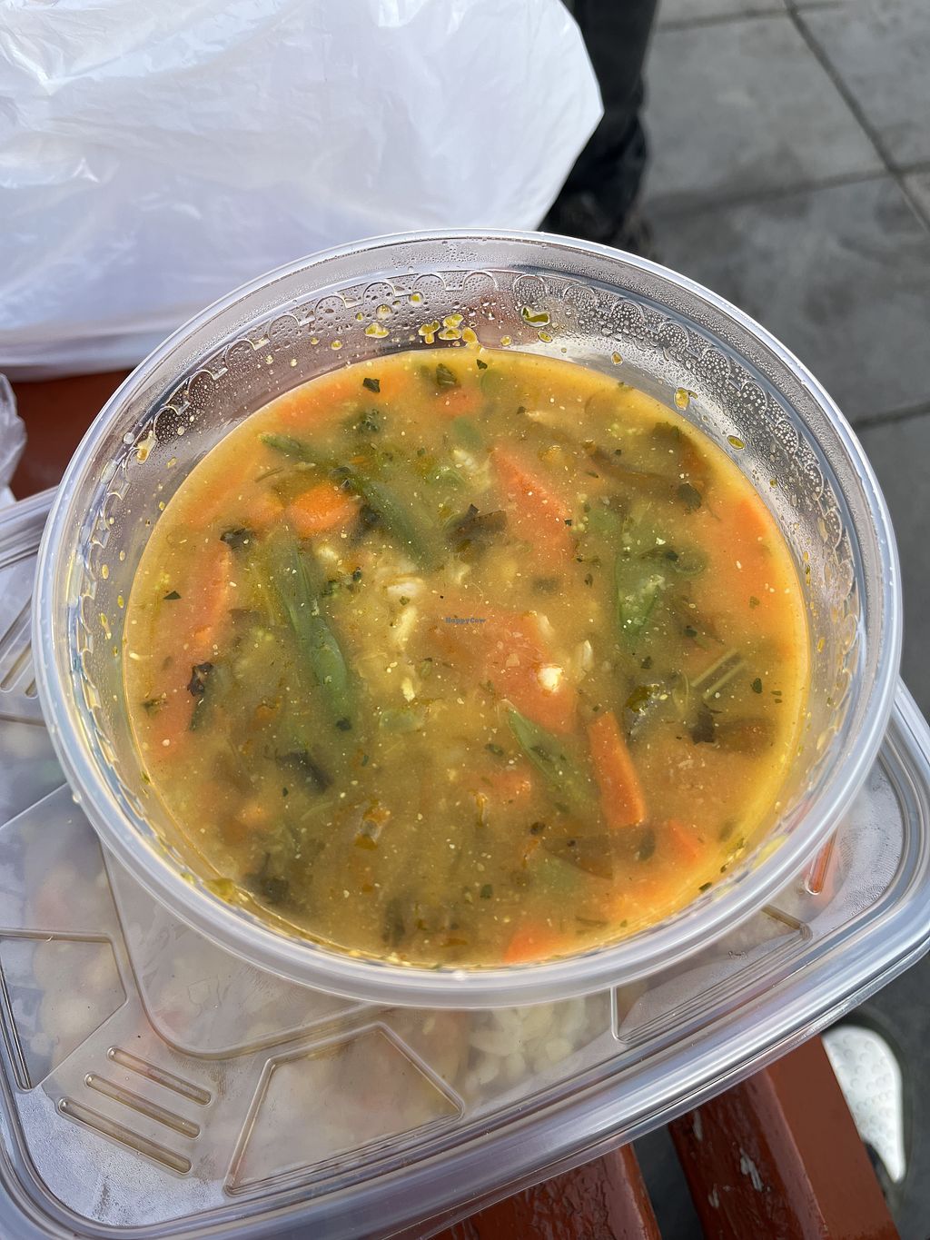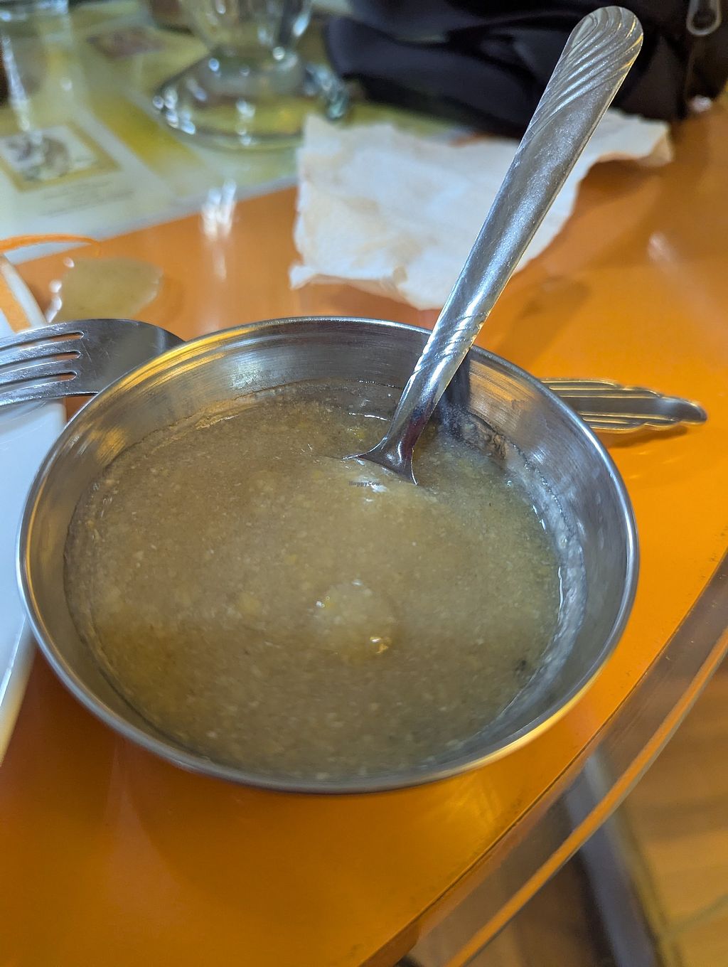 Even though there is a menu posted outside when we went in we were told we only had 3 options. We ordered the first two which we thought were a stir fry with fried soy pieces, and a soup. We were very wrong. We were given 2 soup appetizers, then when those were done we were give a curry type dish and then a plate with the fried soy pieces, a couple cooked potatoes that weren’t washed before cooking, and a couple peppers. I wasn’t sure what to make of it, and the curry dish wasn’t very good.