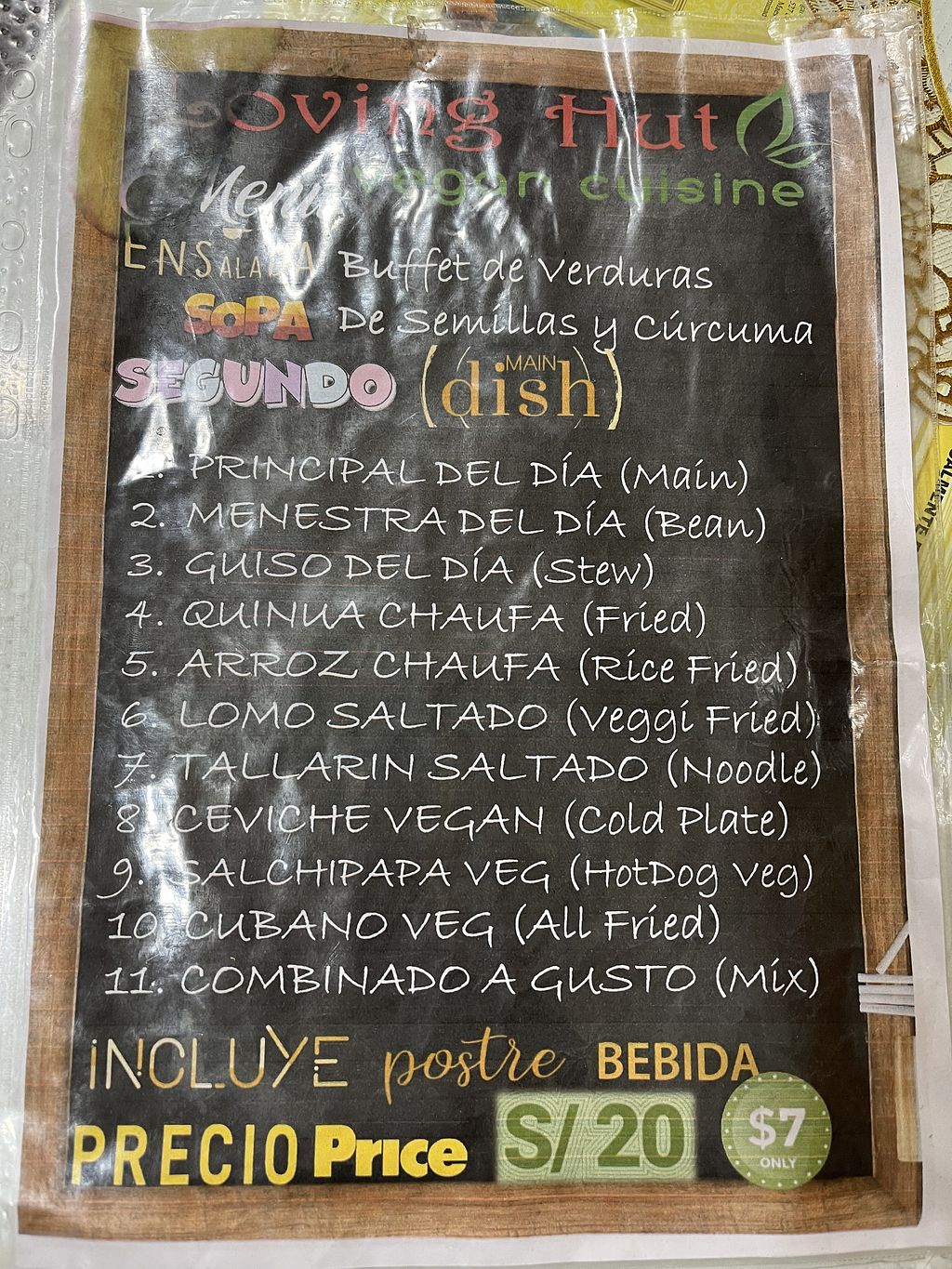 All vegan. Can even buy vegan products (cheese, soy-meat,...). Offer 4-course menu plus drink for 12 soles. Many options to alter set menu for additional 1-2 soles (refills, switching desert, eating two mains,...). Definitely enough food to satisfy hunger in the 4-course menu. Traditional Peruvian dishes veganized. Recommend. :)