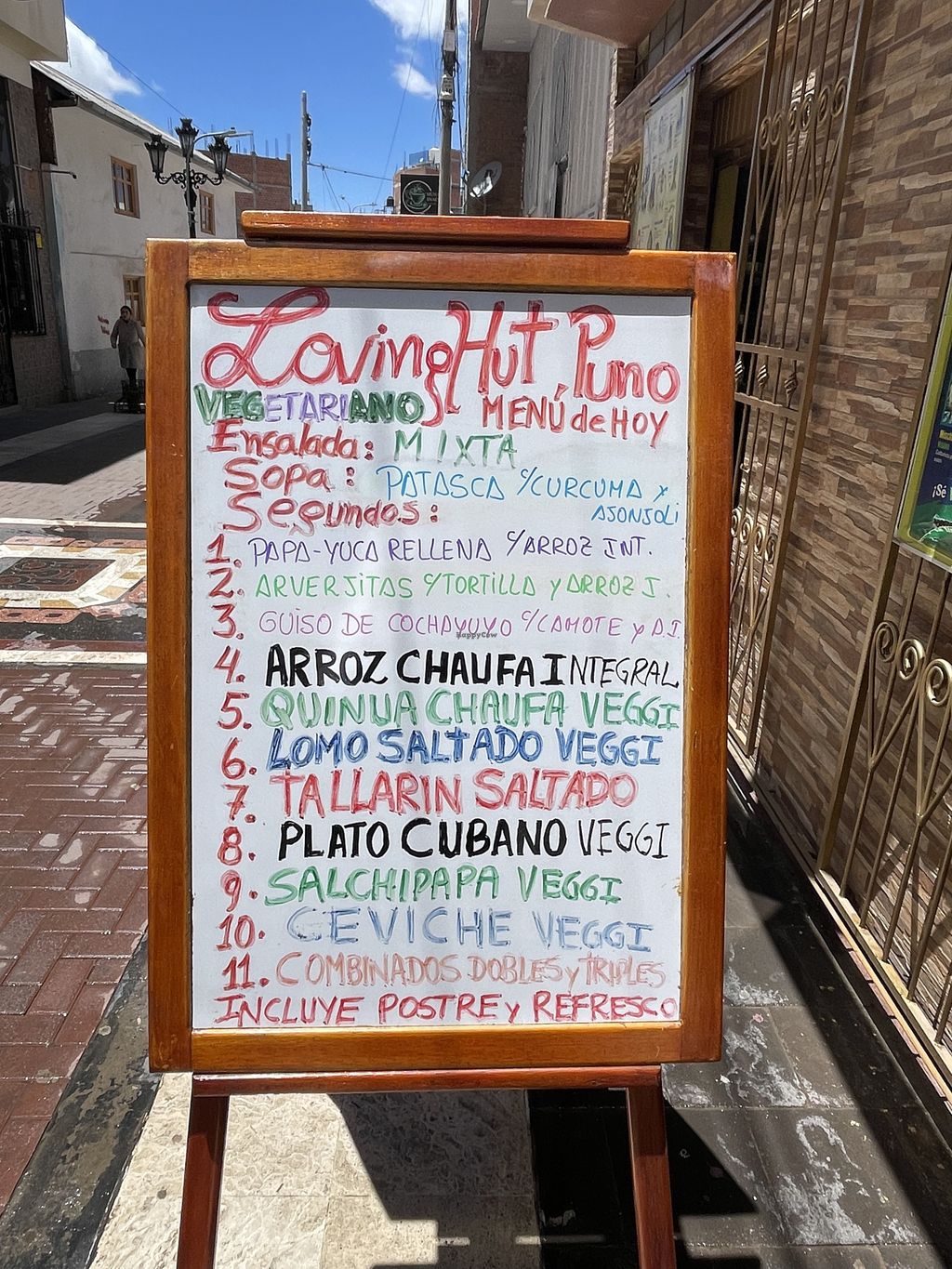 Puno isn't known for its vegan restaurants, and Loving Hut is the best of the very few spots you will find in the town. Unfortunately, they close at 5, so dinner is either early or you have to find someplace else. We had a nice set menu lunch and stocked up on various vegan snacks sold in the little store before leaving.