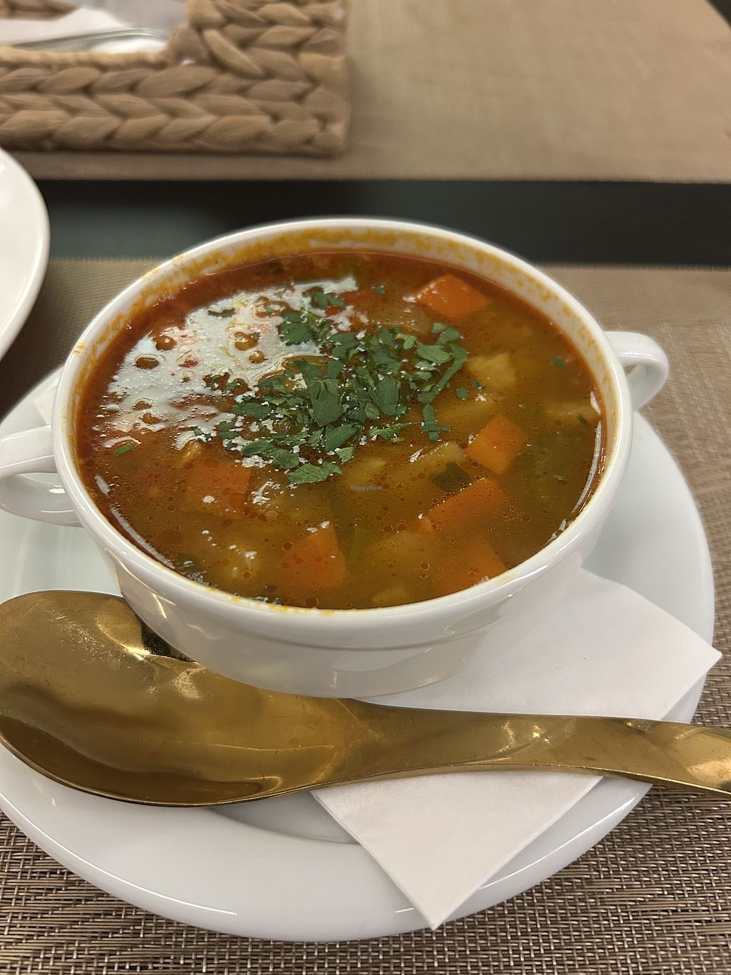 Nice restaurant with a big vegan menu. Spent almost 30min on choosing as there was so many dishes. Opted for spicy soup as stated and a burger with side and drink & my hubby got potato soup an royal snitzel . Both lovely an very filling 👍🤤🥳