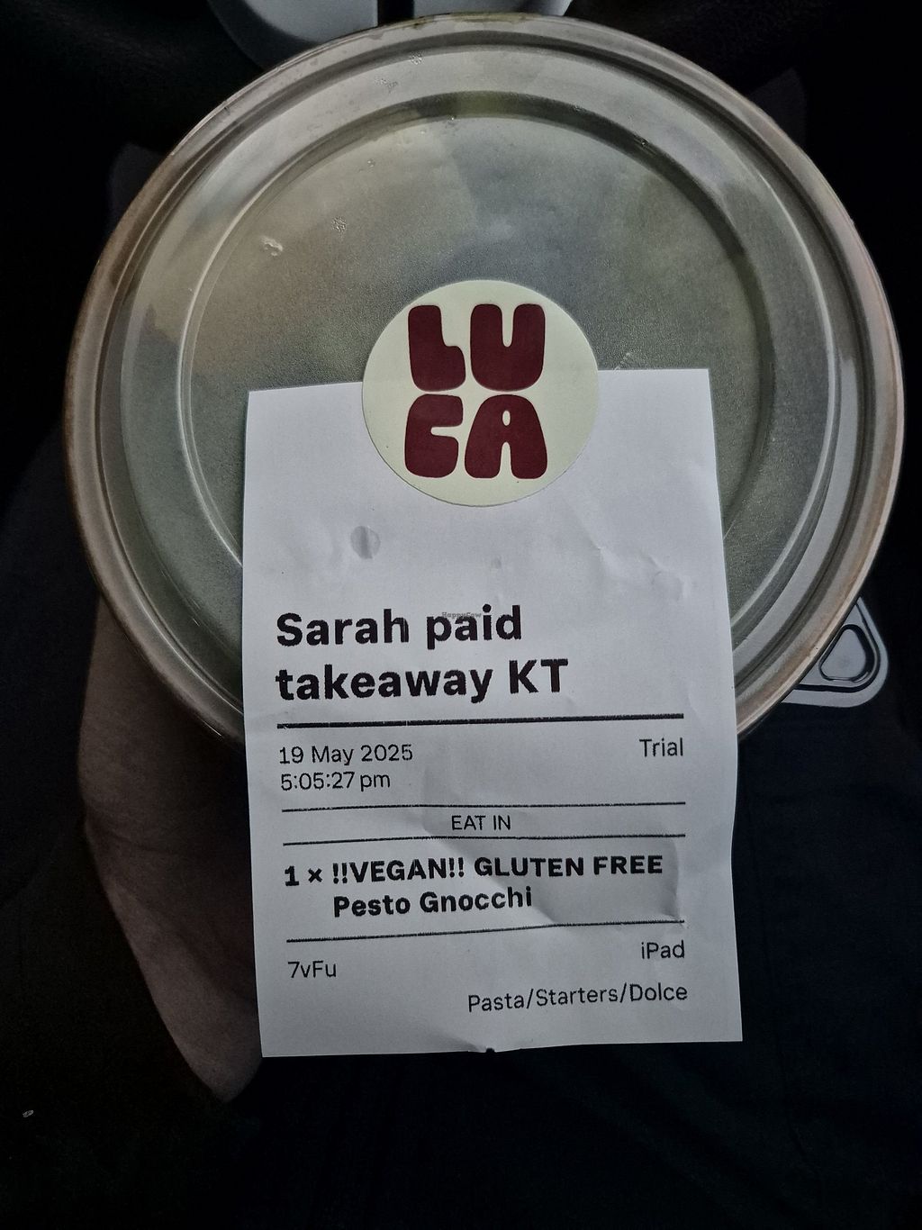 It's always SO NICE to see vegan items on a menu, but to have a WHOLE SEPARATE vegan menu is amazing! There's a few pizzas, some gnocchi and salads onto the vegan menu. I chose the pesto gnocchi. It was really yummy, and very garlicky! Also a good portion for dinner. What I especially loved about the takeaway receipt was, how clear it is that they take care to make sure vegan orders are clearly ordered as vegan. You know that moment when you wonder if you asked clearly enough for a "vegan" meal? This alleviated that question for me.