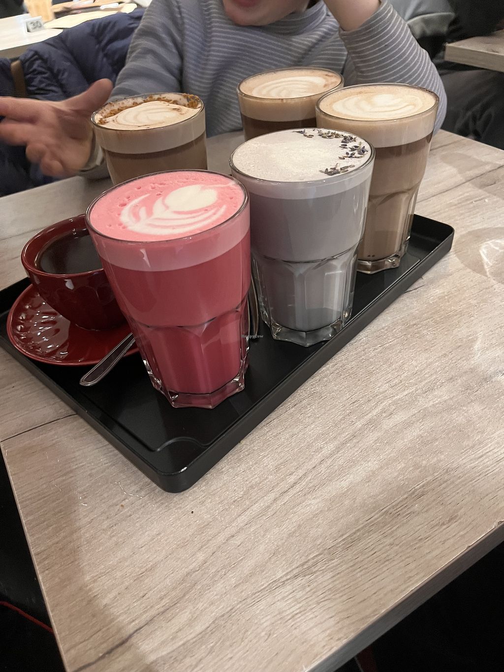 Pink latte, lavender latte, hot chocolate, bucket brew