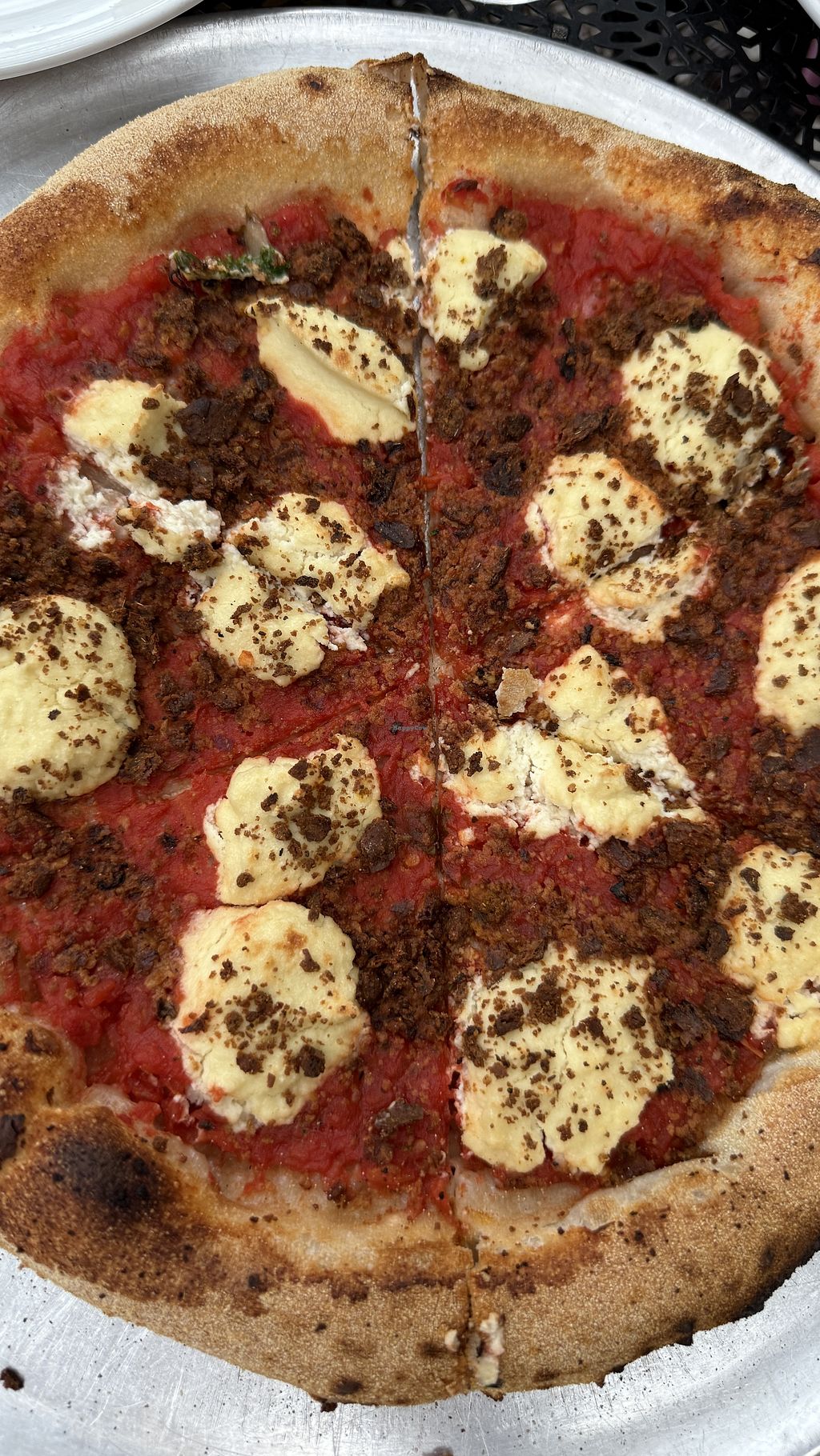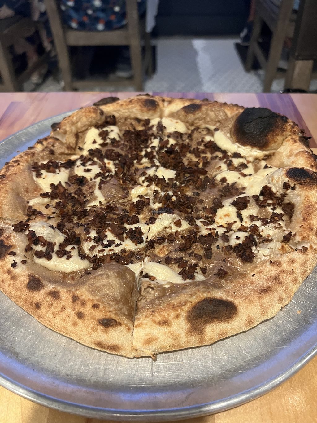 Best vegan pizza I’ve ever eaten. The vegan cheese and crust are to die for. A little pricy but totally worth the splurge for the quality. Disappointed that they feel the need to offer dairy and meat alternatives when it’s soooo good. Fried artichokes are to die for, roast tomatoes were also very good. Truffle pizza and macho man both excellent. Was so good we ordered another pizza to go!