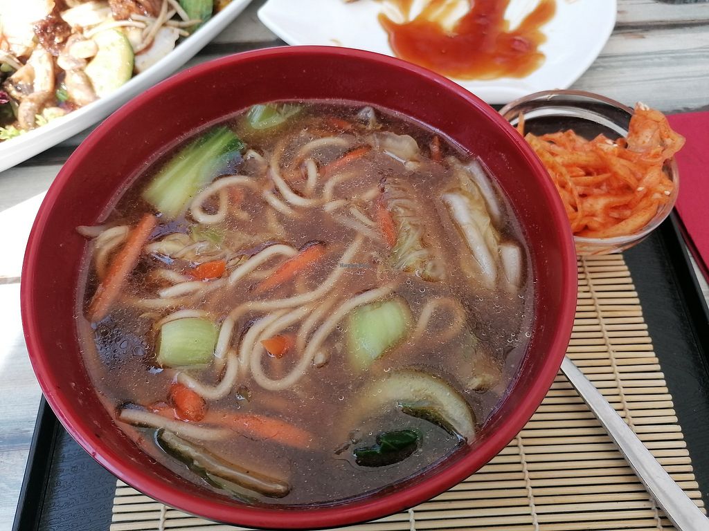Wir wollten gerade hier essen und die junge Chefin hat uns gesagt, dass nichts vegan und vegetarisch ist. Weil alles in der gleichen Fritteuse mit Ente Huhn und Meeresfrüchtn frittiert wird. Also es gibt hier nichts wirklich Veganes und eigentlich auch nichts Vegetarisches.