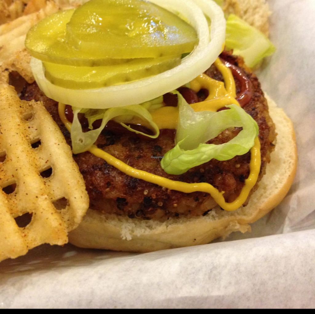 Vegan burger and a mixture of Cajun & Garlic waffle fries