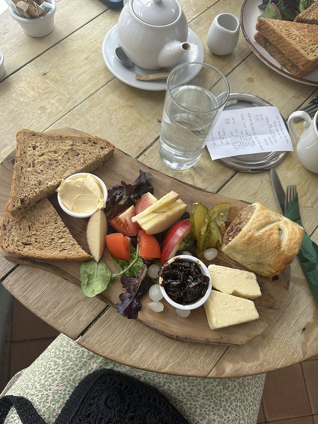 Delightful tearooms with a lovely garden patio at the back! Hummus Toastie & Vegan cake on the menu! Opted for the delicious vegan Ploughman's Lunch! With a Vegan sausage roll, vegan cheese, bread & salad! Homemade chutney too! Really filling & nicelypresented on a board! Several Plant milks available! Very friendly attentive service! Can highly recommend! GF Bread option also available.