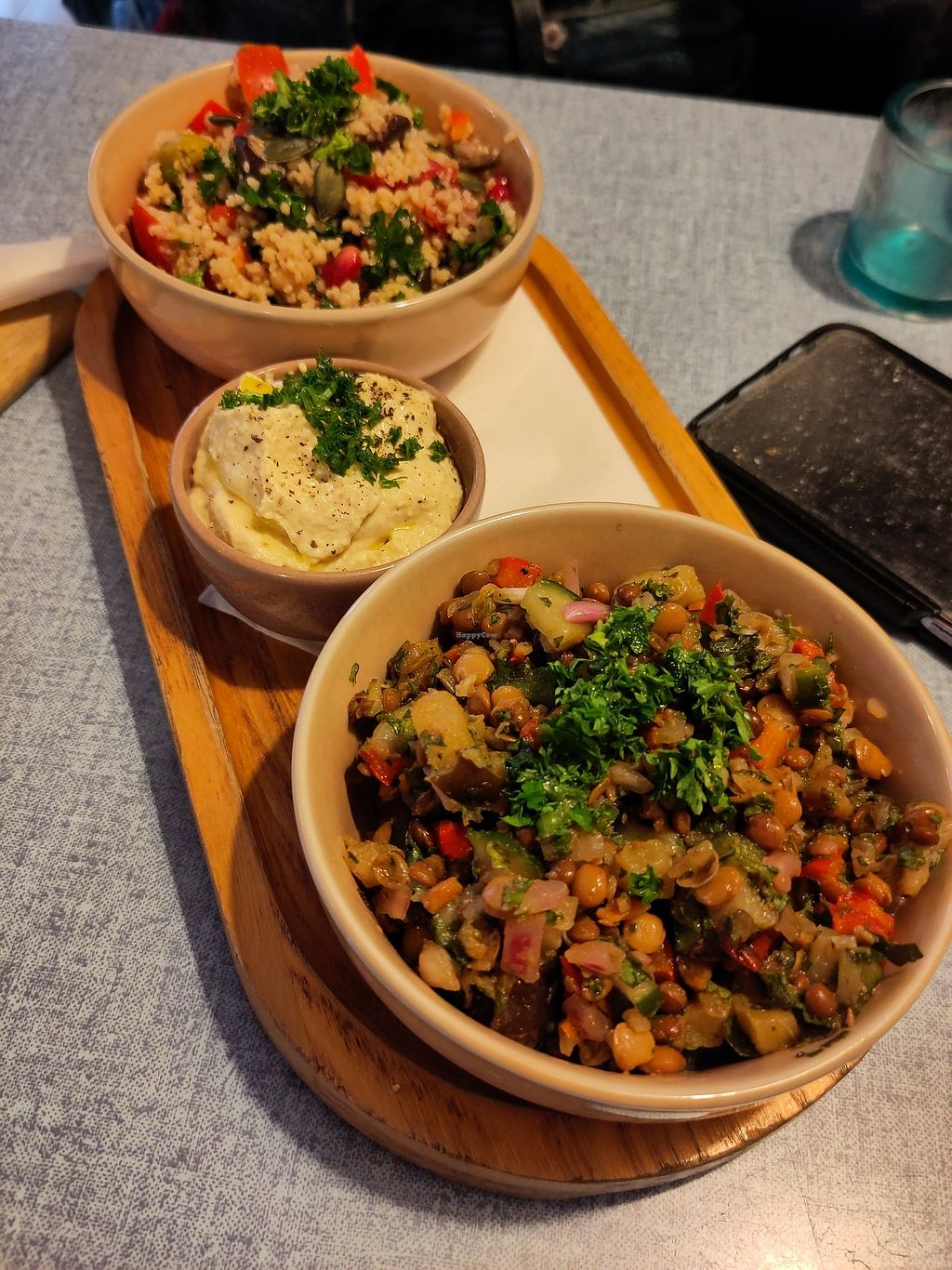 Two different salads and hummus