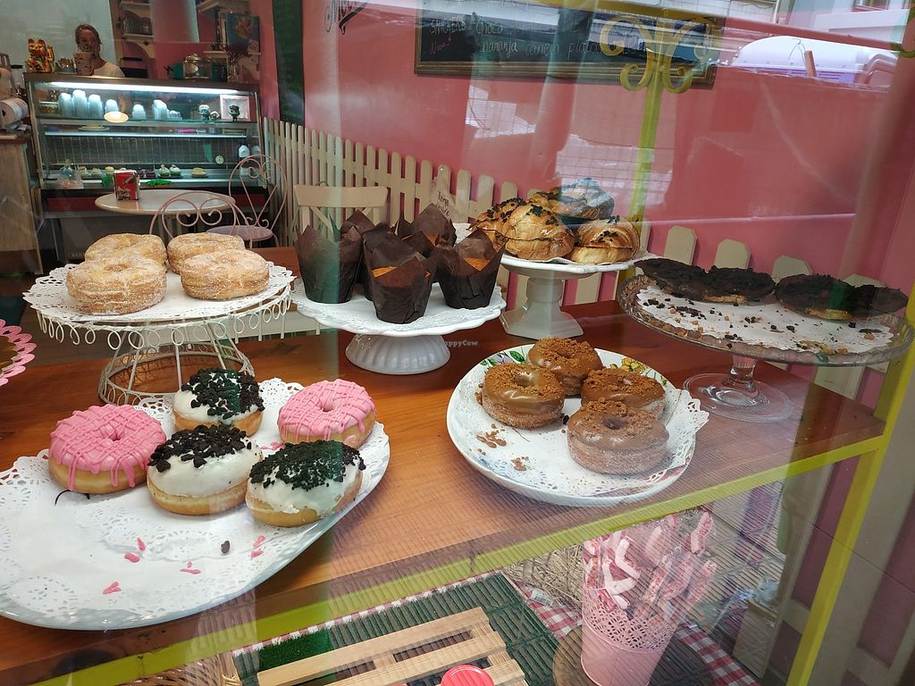 Lo que más me gusta de esta pastelería son los Donuts de Lotus y los croissants de crema de cacao. Recomiendo 100%. Tiene la mitad de la estantería del escaparate vegan.