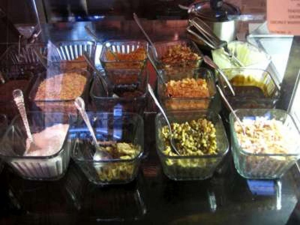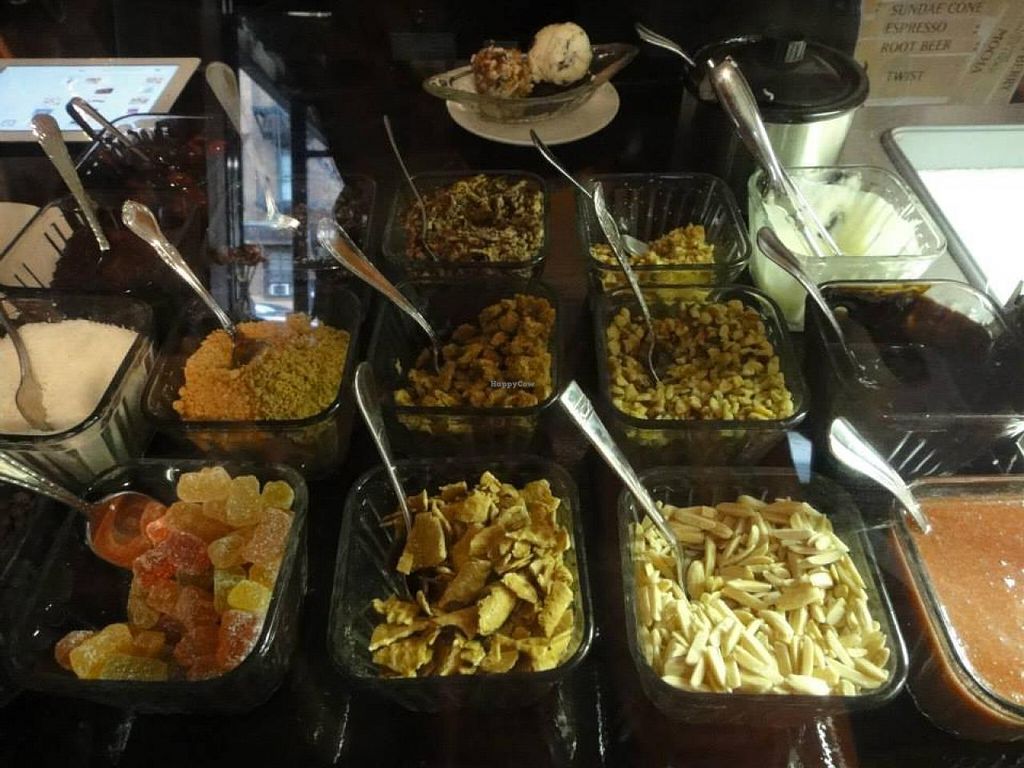 Vegan sundae with vanilla malt cashew ice cream, cookie dough soft ser…