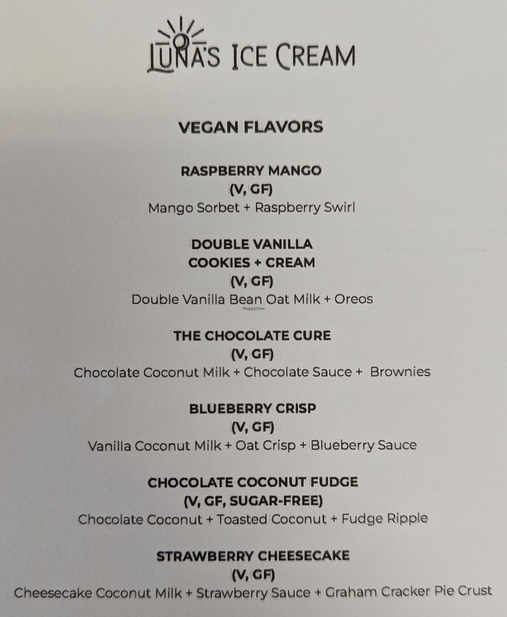 6 vegan options when we went: 2 sorbets and 4 ice creams all gluten free as well! We sampled every single one and they were all amazing! The owner was the one in that night and he was super nice! Would totally recommend this to any vegans wanting a sweet dessert.