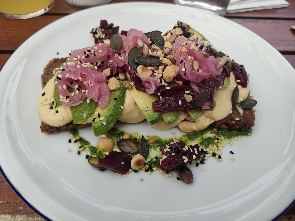 Friesenvollkornbrot mit Hummus, Avocado, Rote Bete, gerösteten Kernen …