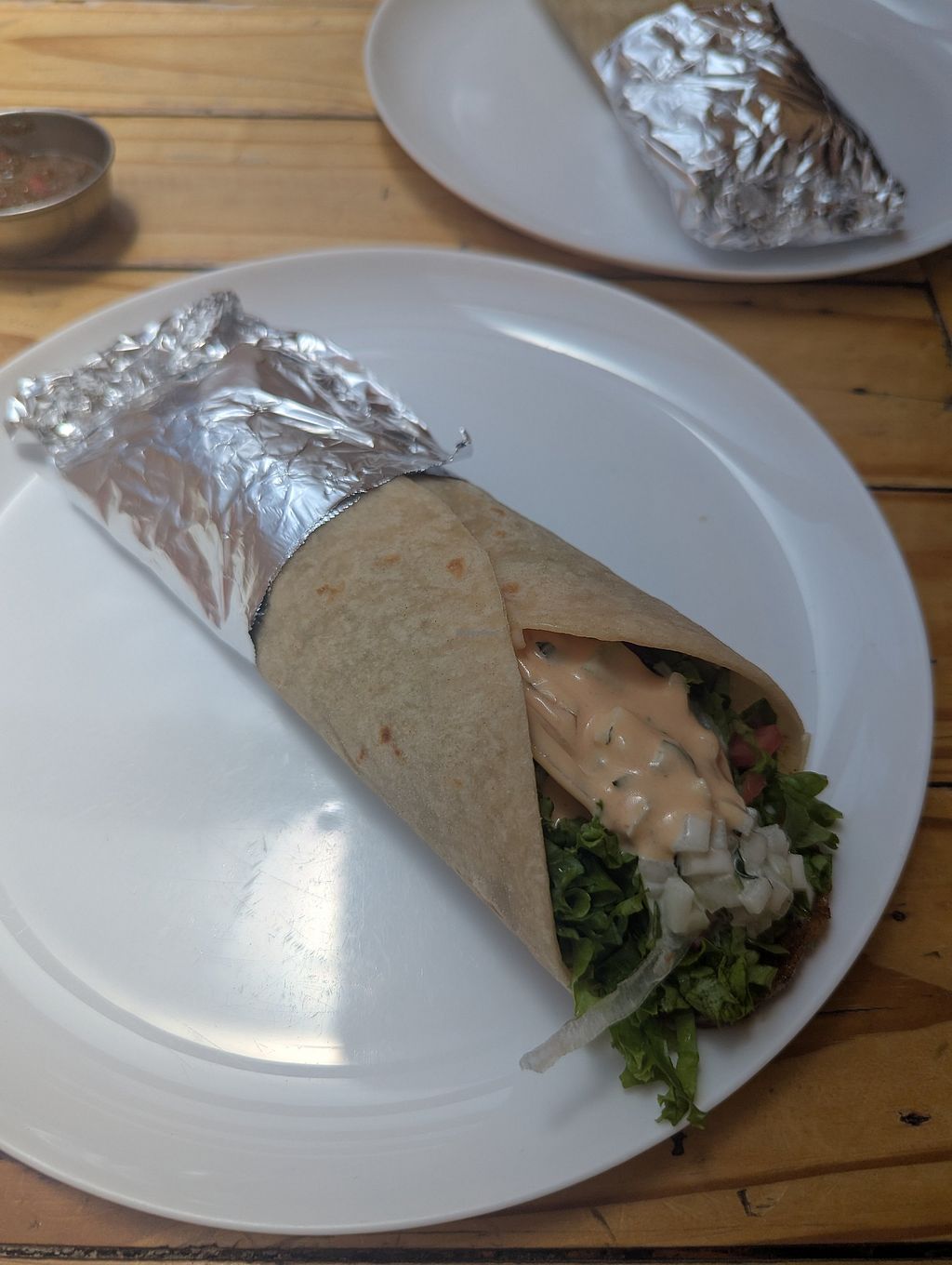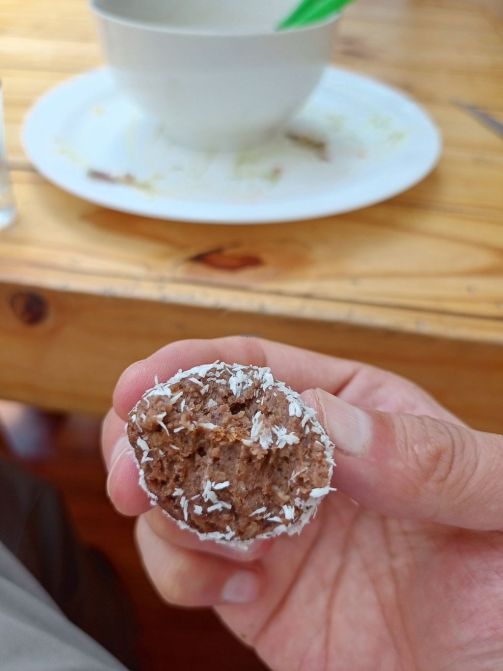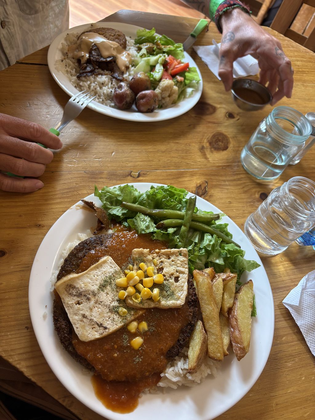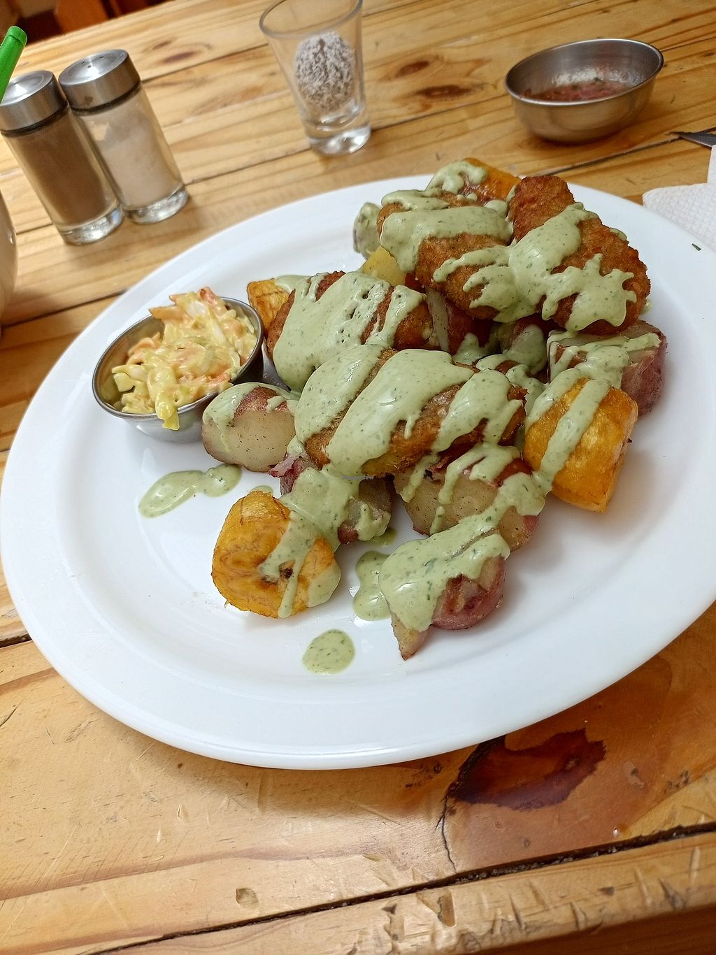 chickpea nuggets with avocado sauce. Fried banana and potatoes. A wond…