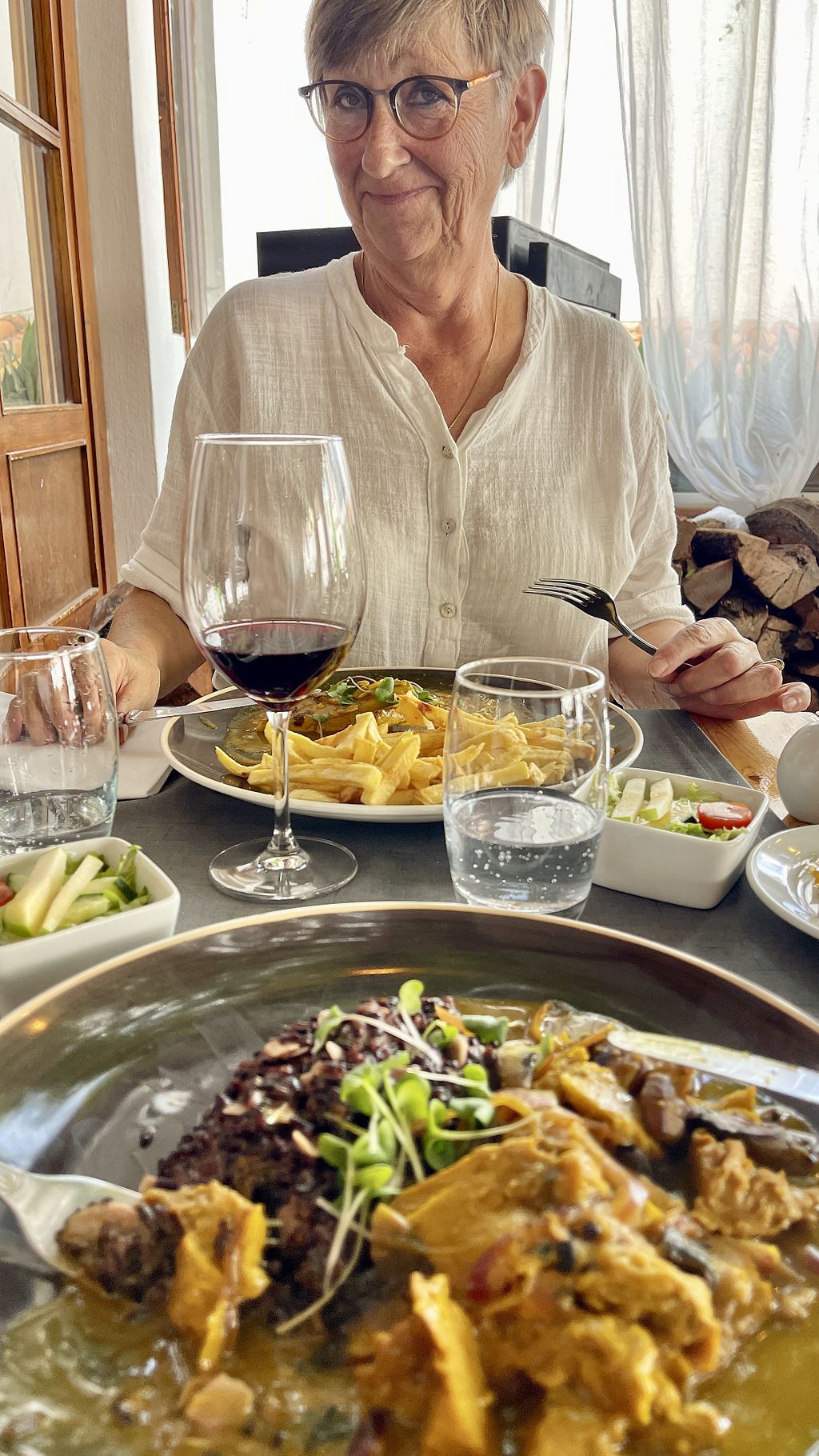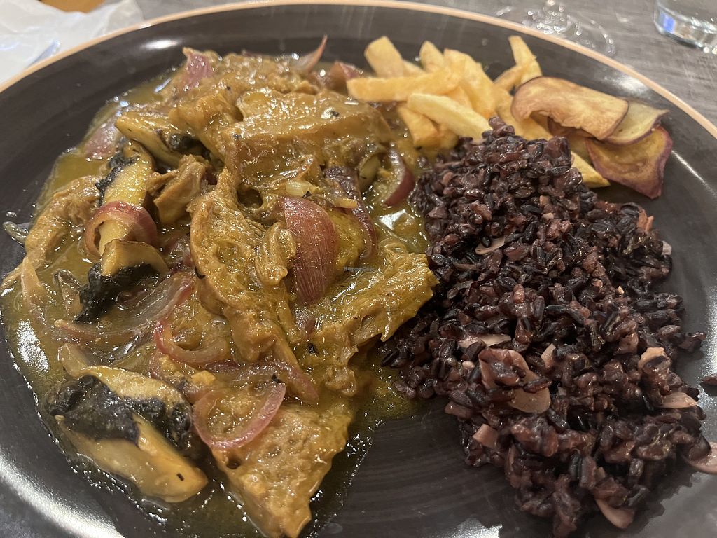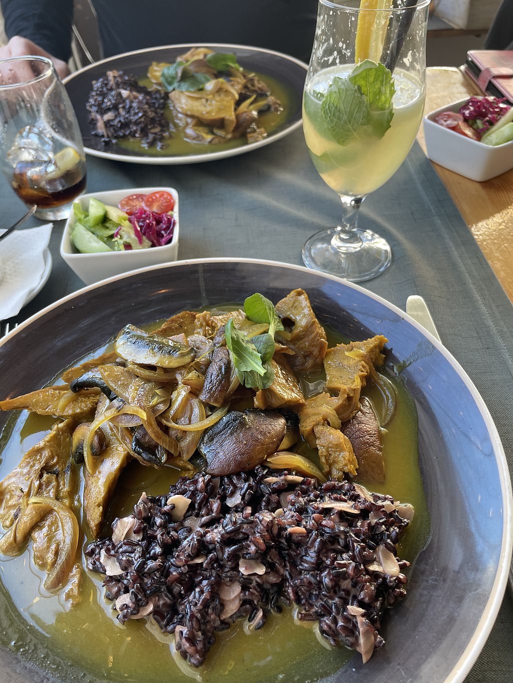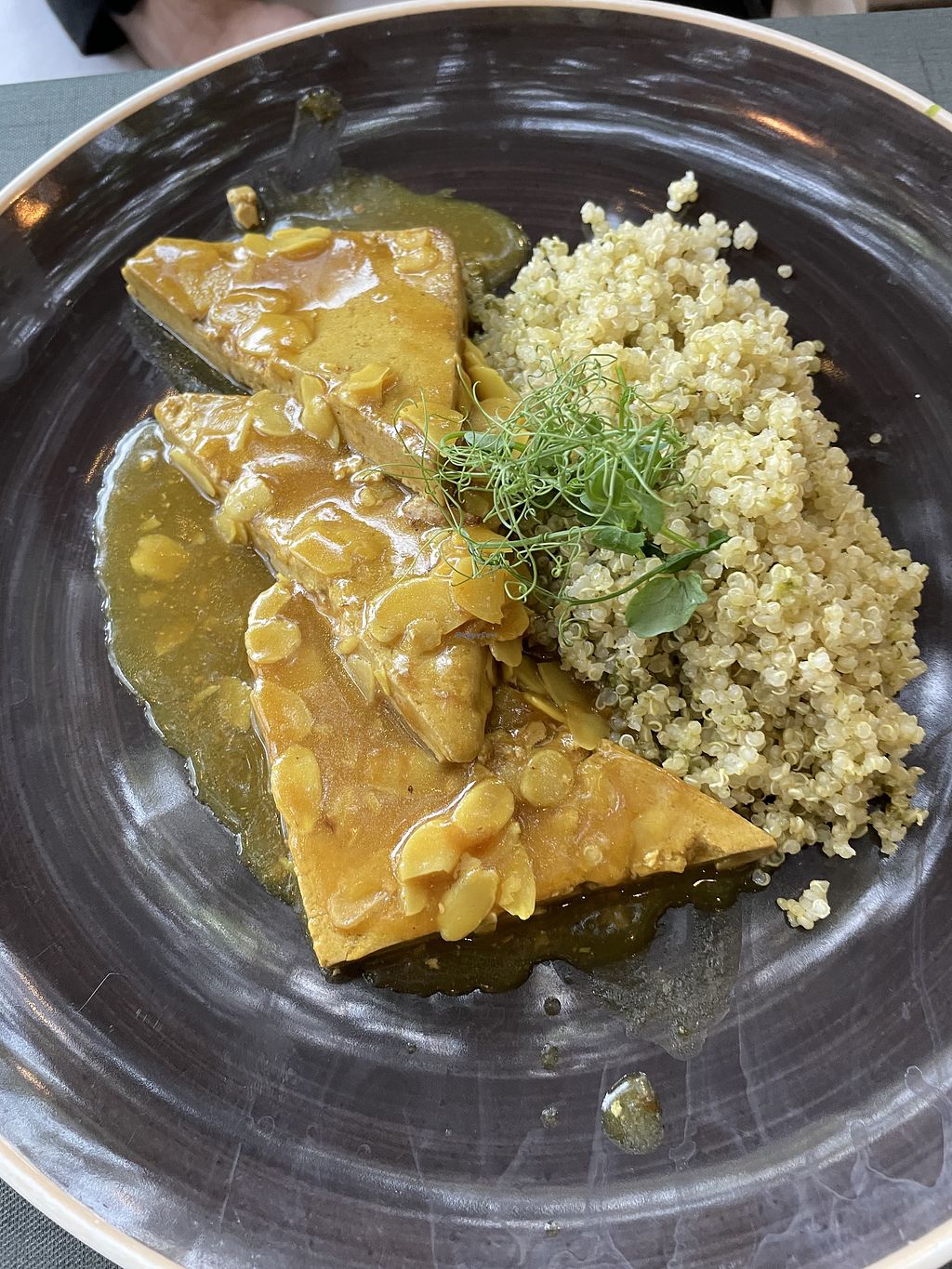 We had the seitan Steak with black rice and the Tofu with orange Sauce and Quinoa. All was lovely presented and WE joined in a great sundowner.