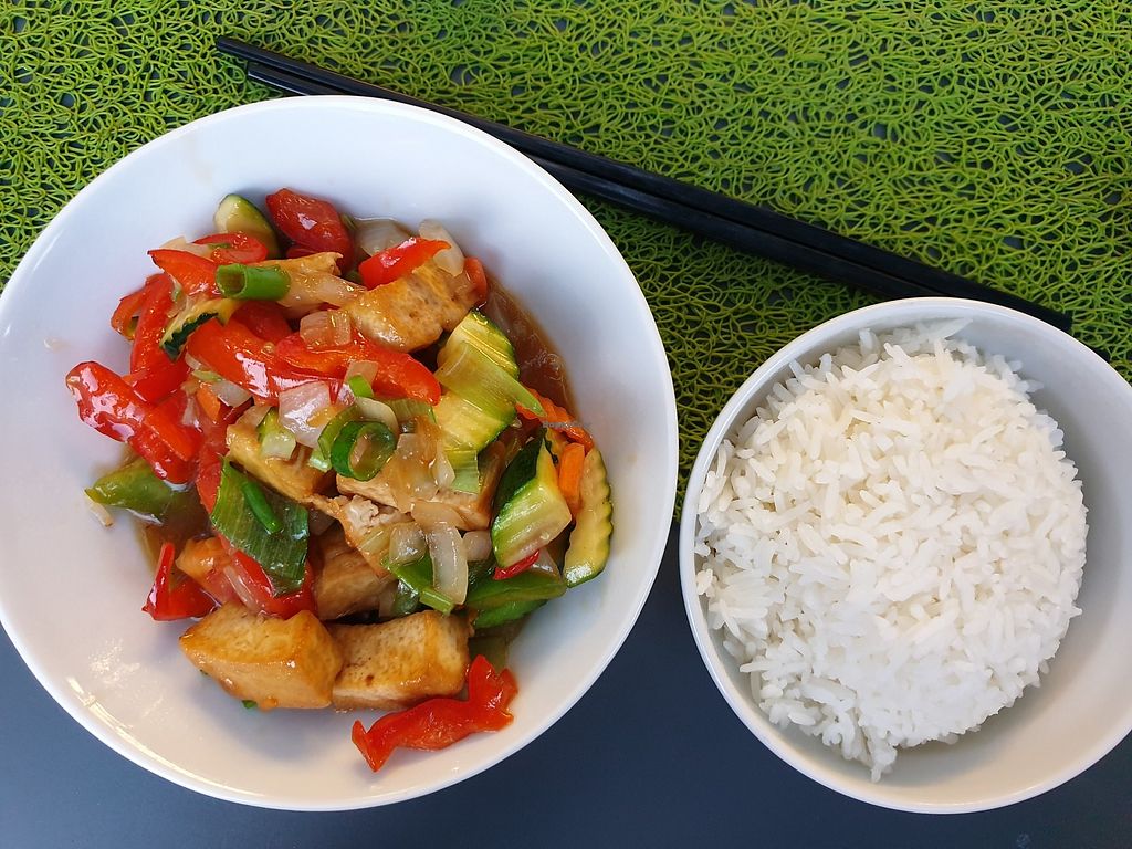 Tofu, veggies and rice on a hot plate