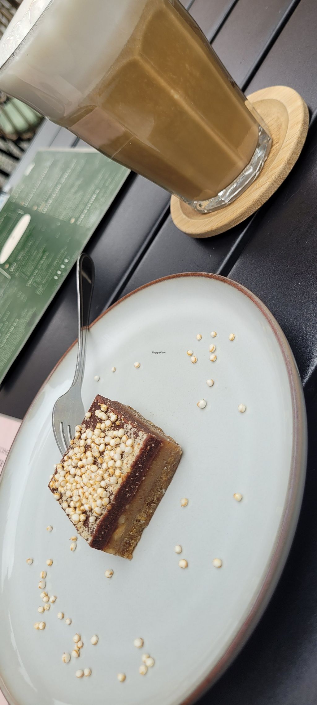 Es war viel los, was bedeutet, dass die Leute den Ort mögen. Es ist nicht vegan, aber es gibt eine große Auswahl. Ich habe einen leckeren Smoothie und einen rohen Kuchen gegessen.