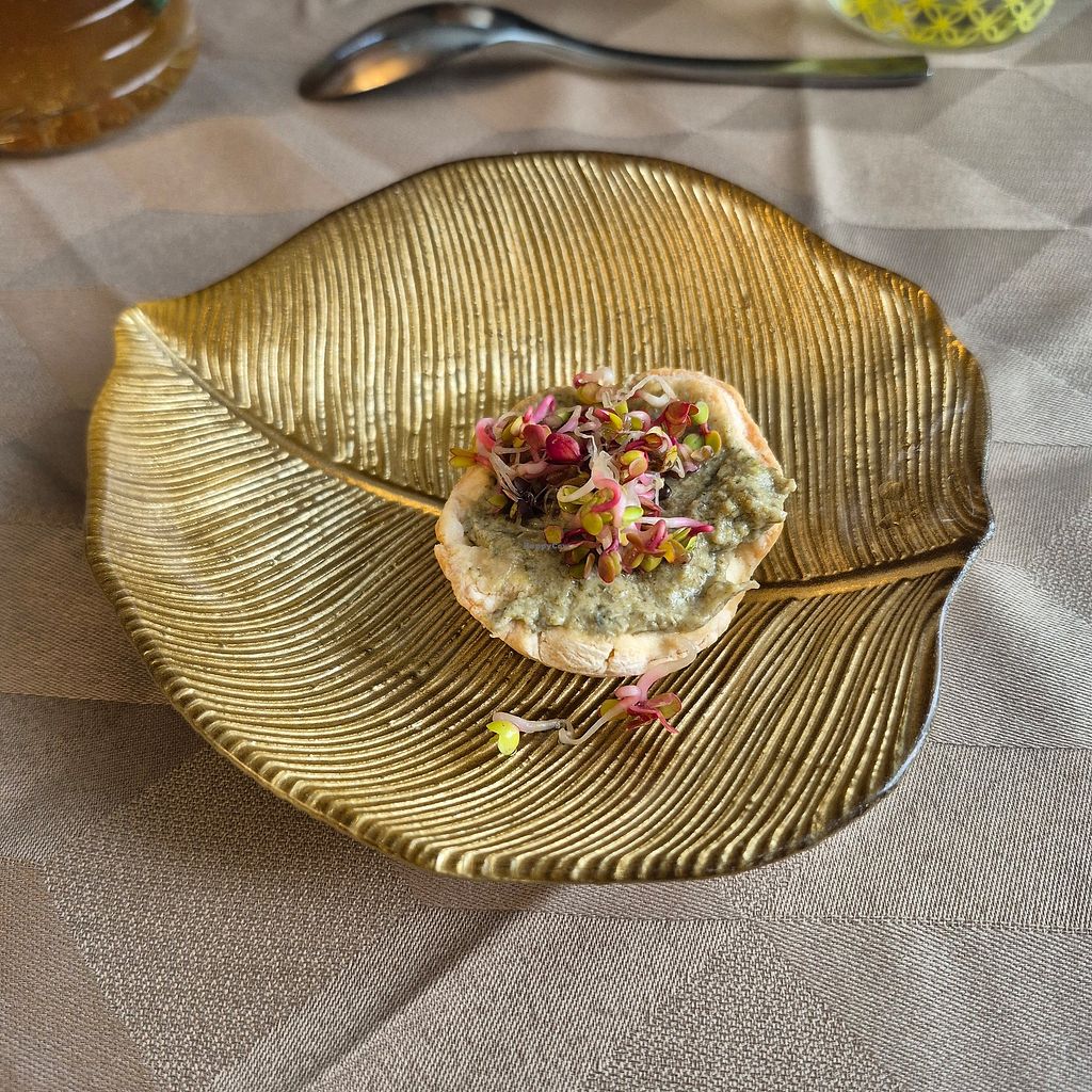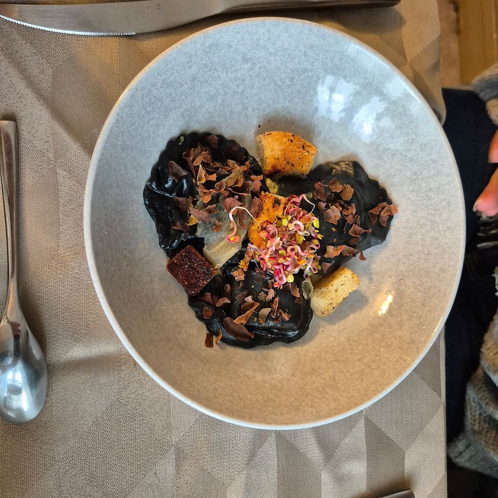 ravioles noires au tofu à l'ail des ours, rillettes aux algues et boui…