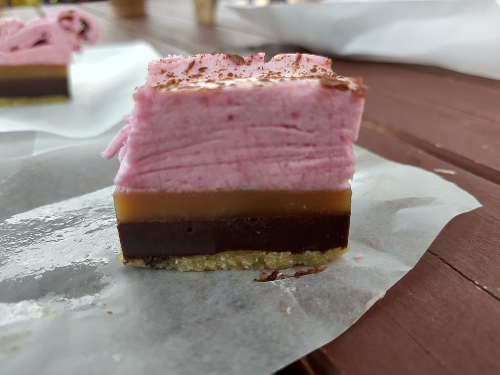 Great coffee - selection of alternative milks. Vegan butter chicken pie, and two GF & vegan treats - a snickers style bar and something delicious called pinkalicious