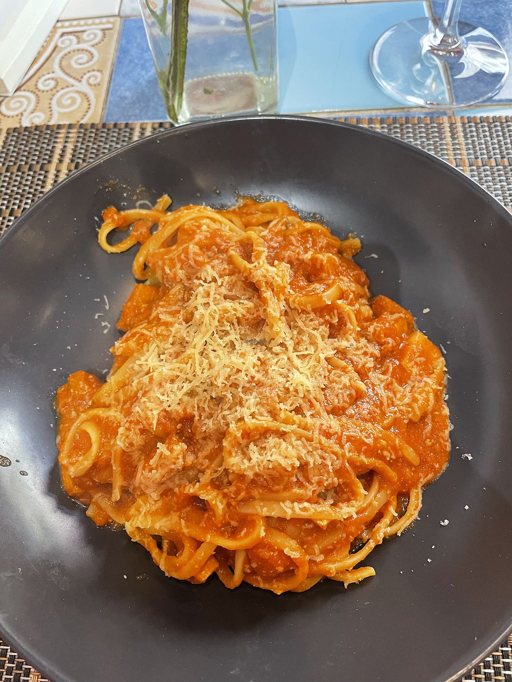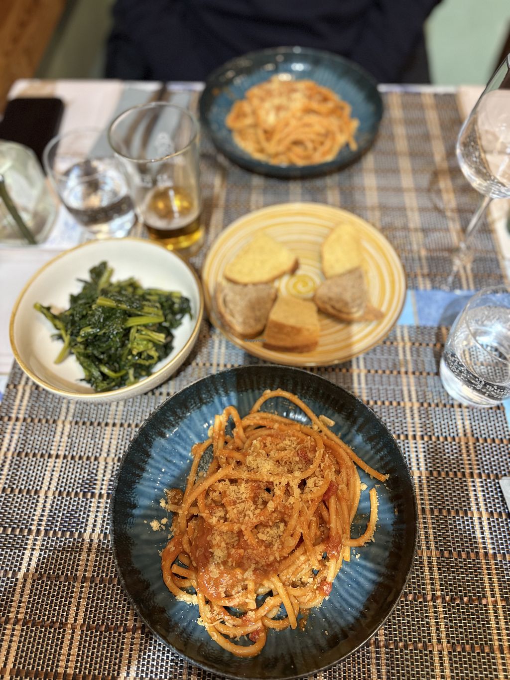 This is a lovely little family-run restaurant with delicious vegan food. We got a carbonara, bucatino amatriciana, side vegetable dish, and a homemade seitan dish that came with a vegan prosciutto.