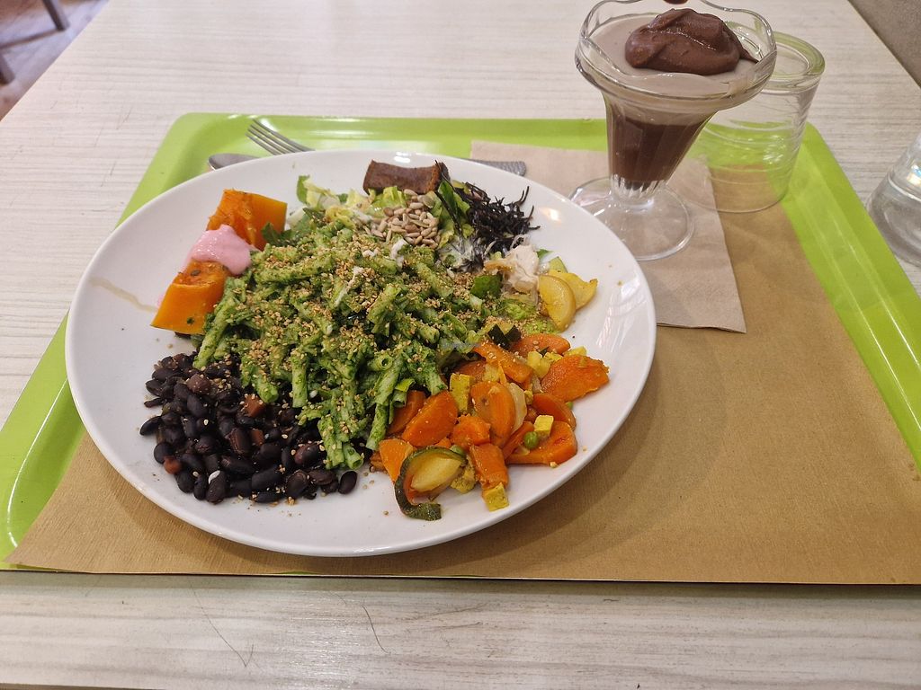 You to to the kitchen, they serve you through a window. You have a few options for the meal, not too many, but who cares when they are good options. quite a few dessert options . Dessert was great. At the end for a complete and filling lunch less than 14 Euro.... apart from vegan its also macrobiotic.