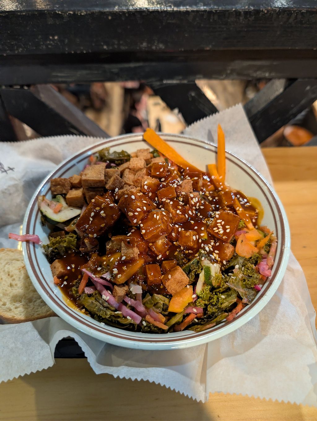 I had the Korean Rice Bowl with crispy tofu. The portion was large and the meal was tasty. I eat a lot of bowls and the Korean style was a nice change.
