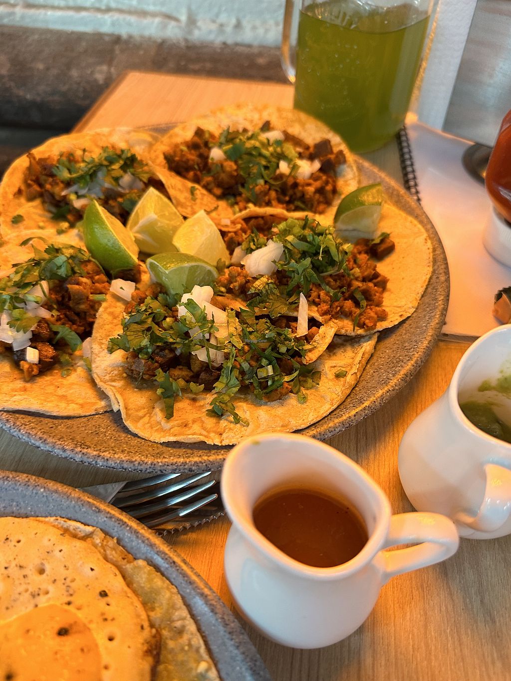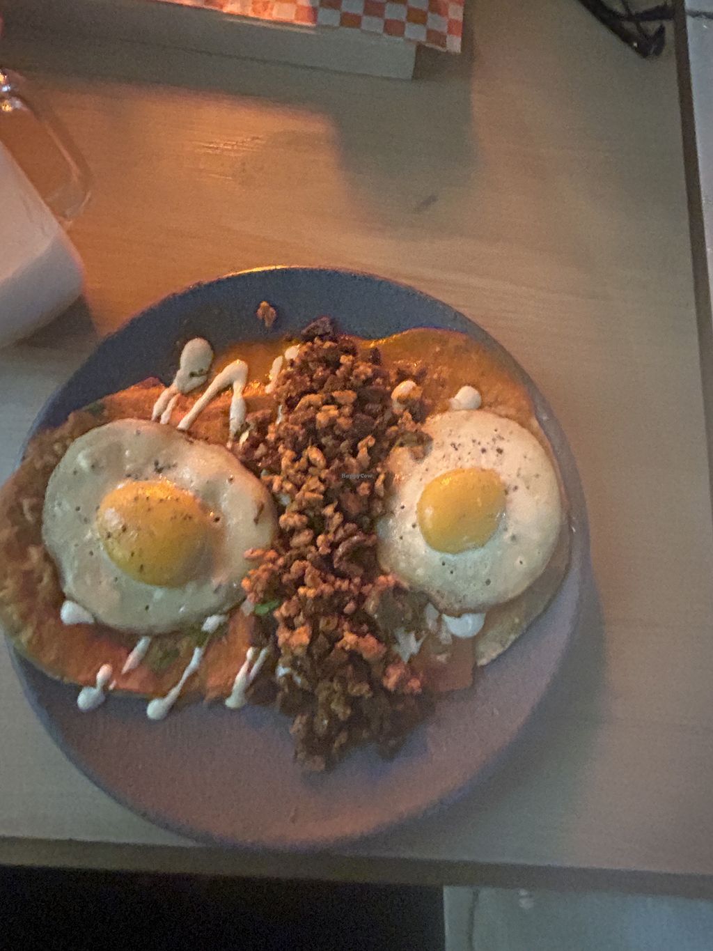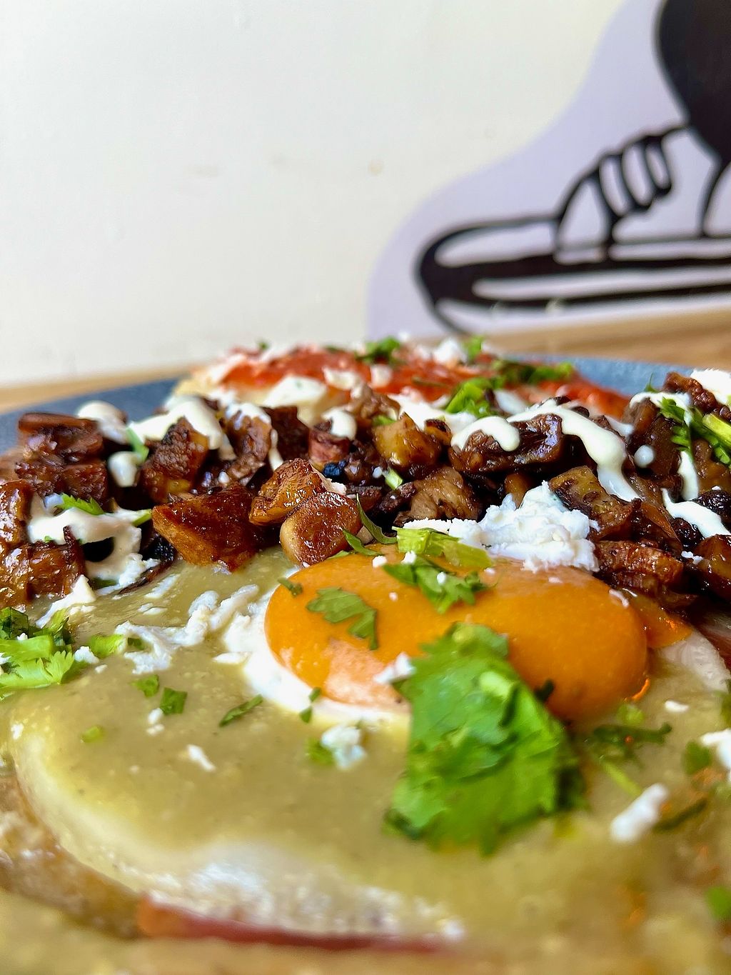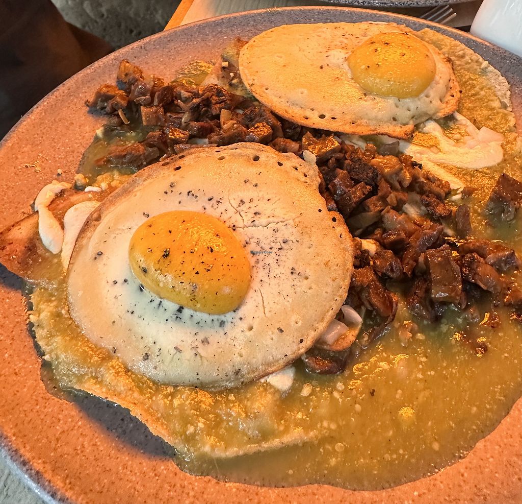 This is the cutest little restaurant on a quiet corner in Roma Norte. The service is wonderful and they speak English. I had the Heuvos Ranchos. It took everything in me not to lick the plate! It was incredible. The eggs are as advertised. I have never seen anything like it and I have never had vegan eggs that match both the texture and taste so well to real eggs. I will definitely be coming back! 10/10