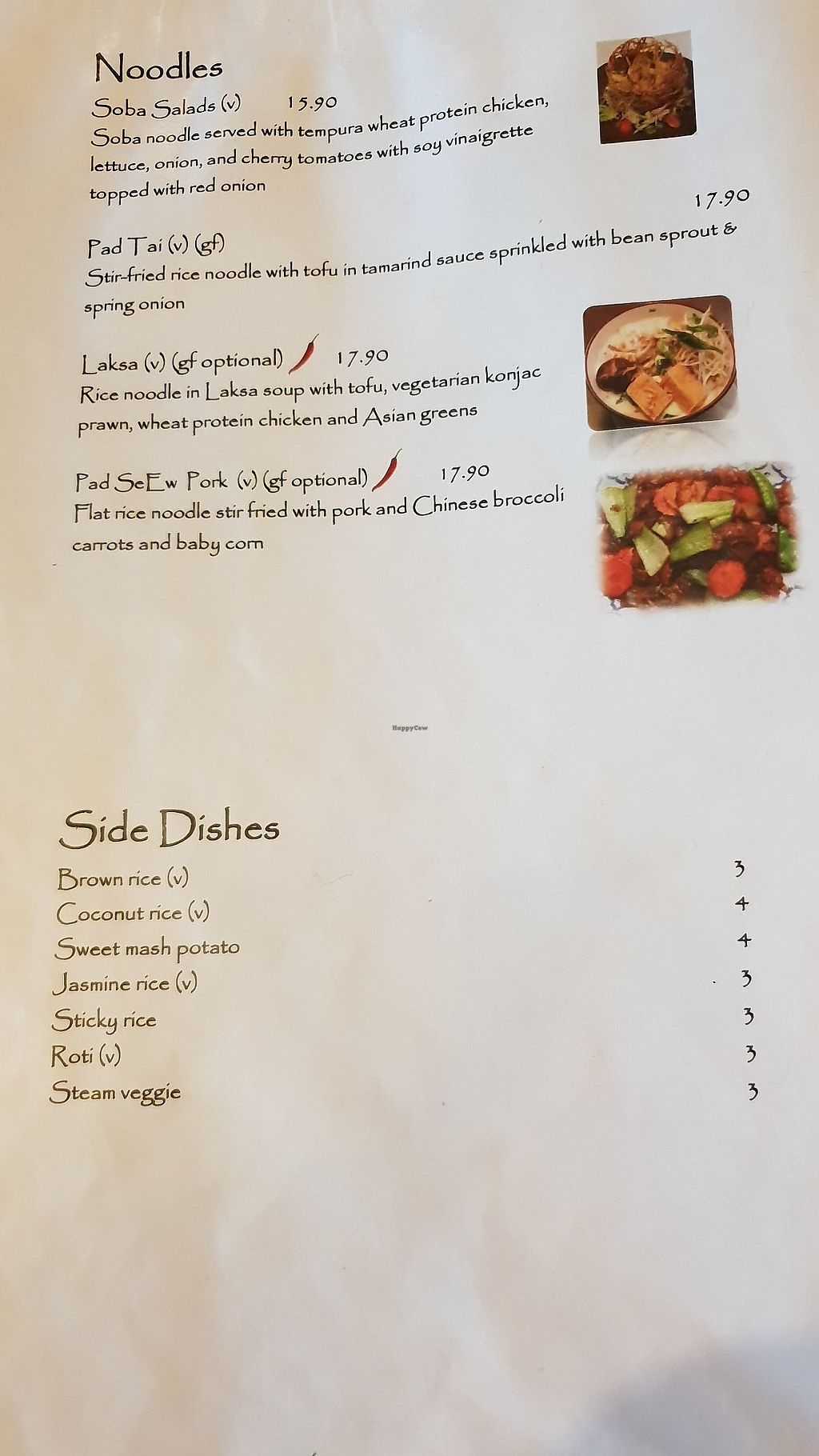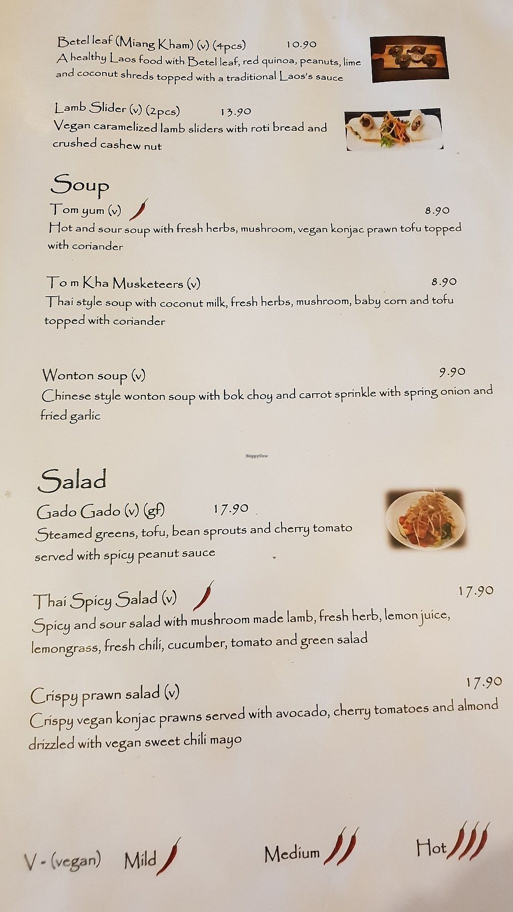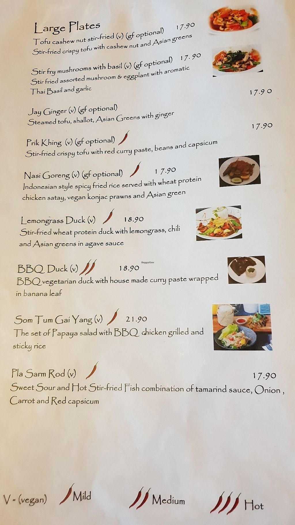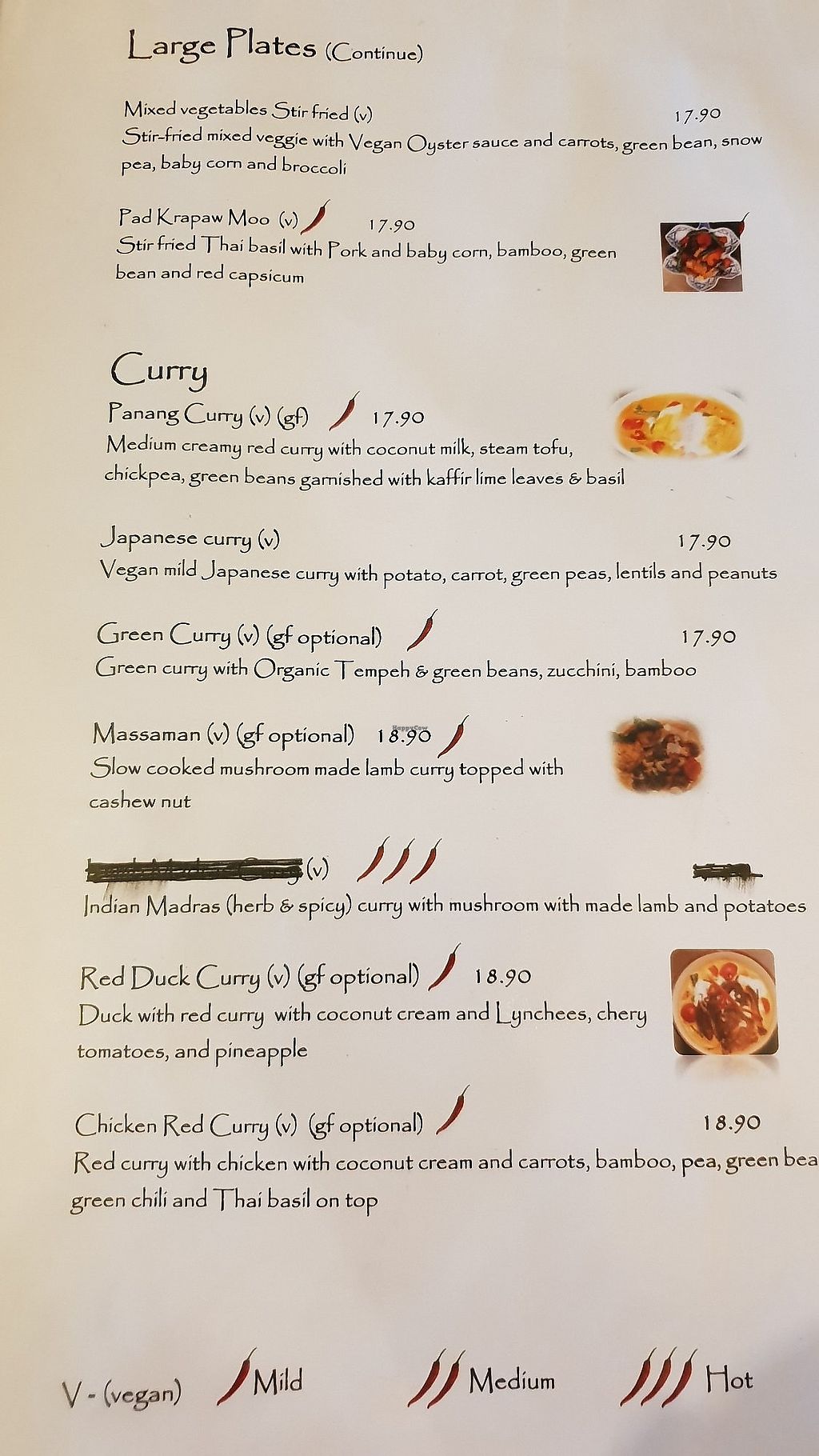 HUGE menu with all of them being vegan despite the fact that they are called traditional dishes with meat in them eg. "red duck curry" + "crispy prawn salad"