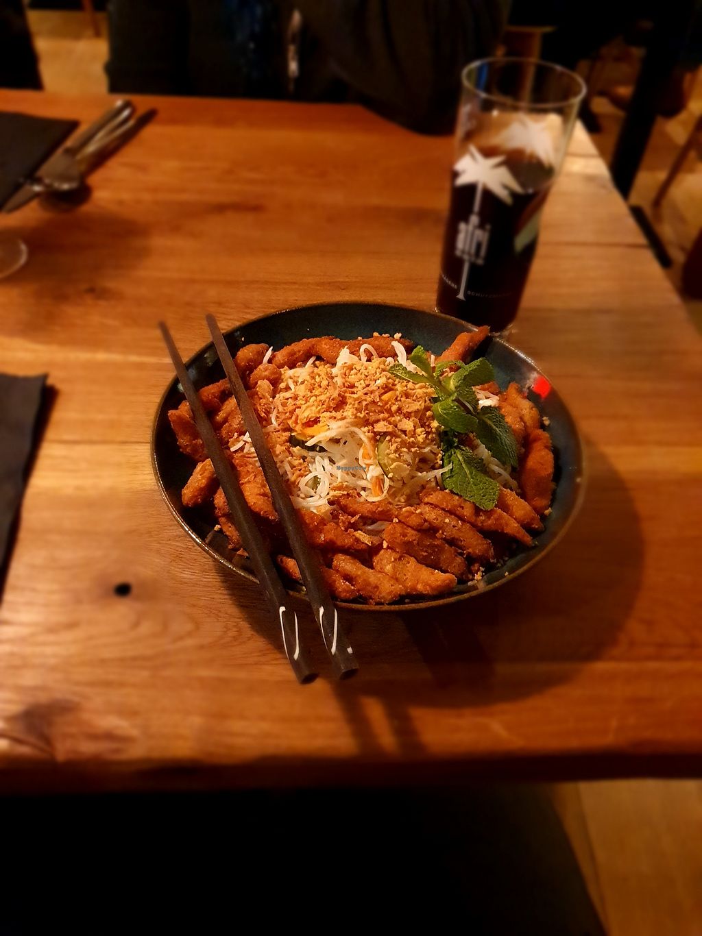 We like to find a good choice of vegan dishes. This time we chose the salad with the roasted soy sheets as well as the springrolls (wich we love). We shared both and recommend these dishes. Our main dishes (fried tofu vegetables and dark soy meat lemon grass) were very well. We like when the vegetables aren’t overdone but are firm on the bite. We like the composition of the dishes.