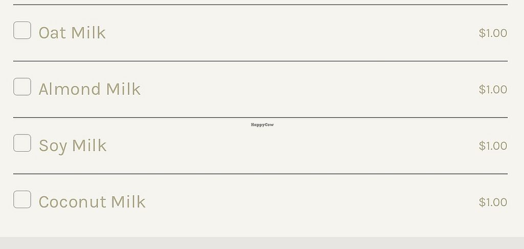 Coffee shop offering alternative milk options including oat milk, almond milk, soy milk, and coconut milk. Open Mon-Sun 7:00am-4:00am.