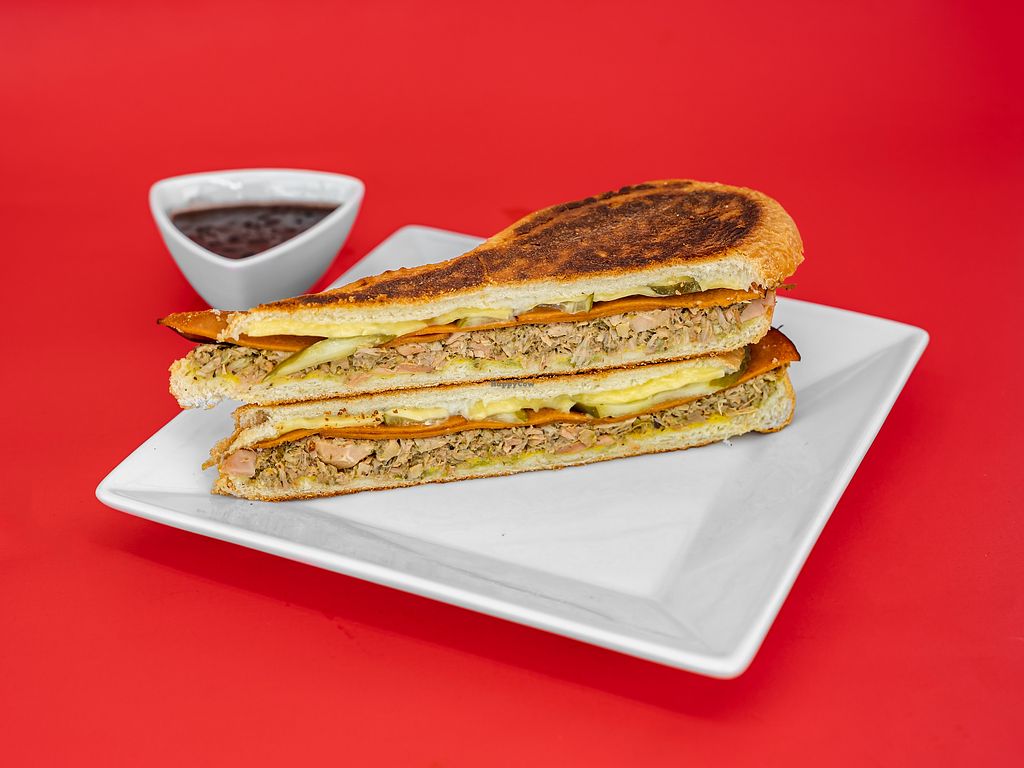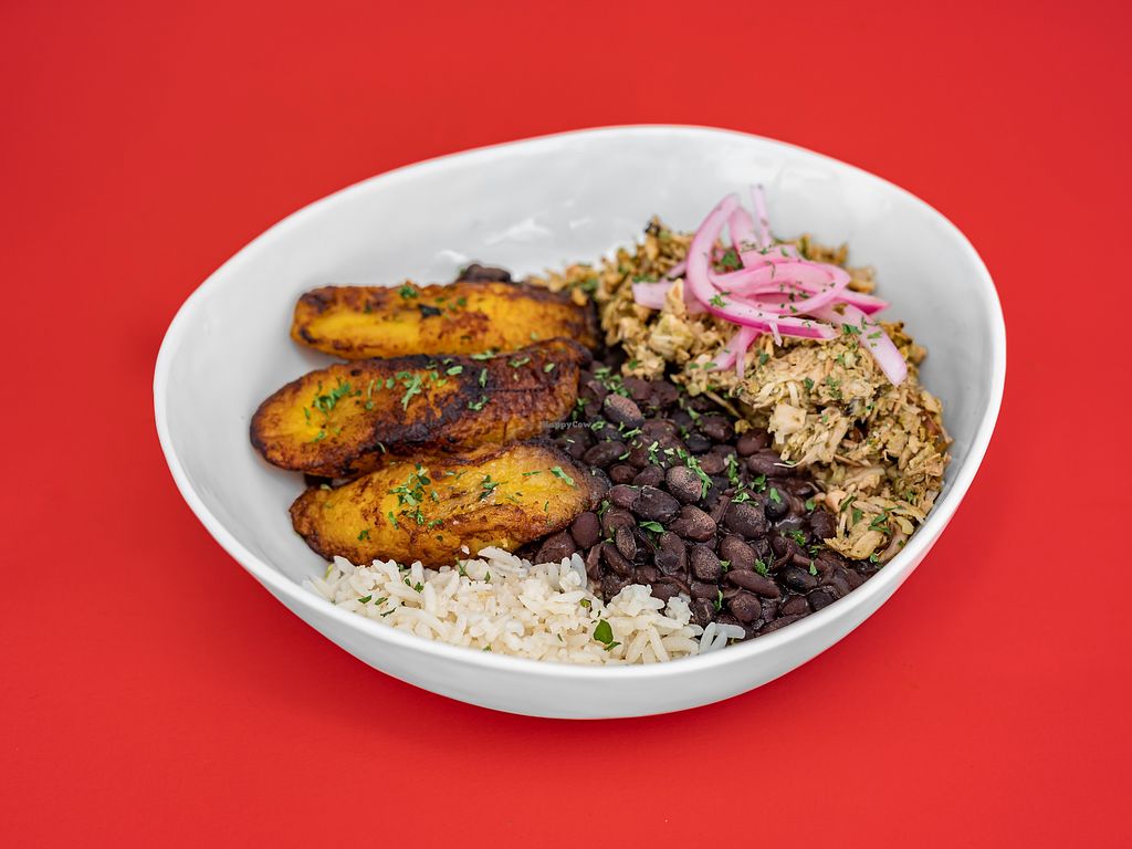Serves meat, vegan options available. Restaurant offering vegan and veganizable sandwiches and bowls, including a vegan sandwich with jackfruit and vegan cheese, vegan ropa vieja (jackfruit-based), and a vegan Cuban bowl with jackfruit, rice, black beans, sweet plantains, and pickled onions. Open Mon-Fri 12:00pm-8:00pm, Sat-Sun 12:00pm-6:00pm.