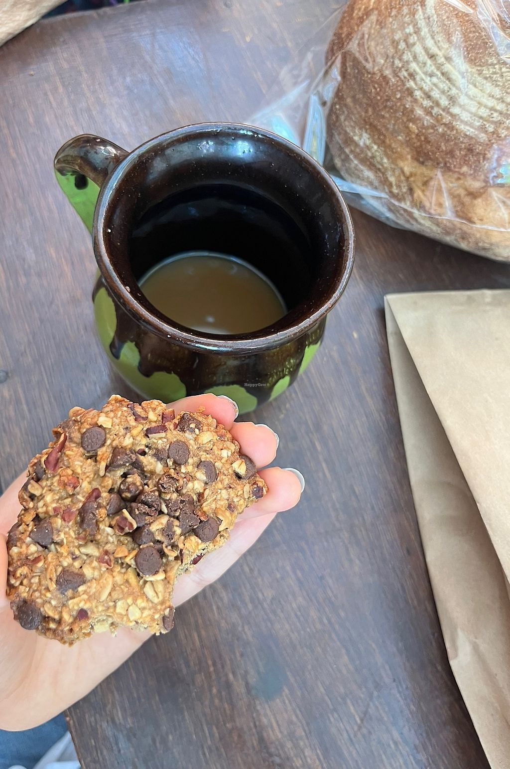 Tiene deliciosas opciones a base de plantas, les recomendó las galletas de chispas, también todo el pan a base de masa madre está delicioso.