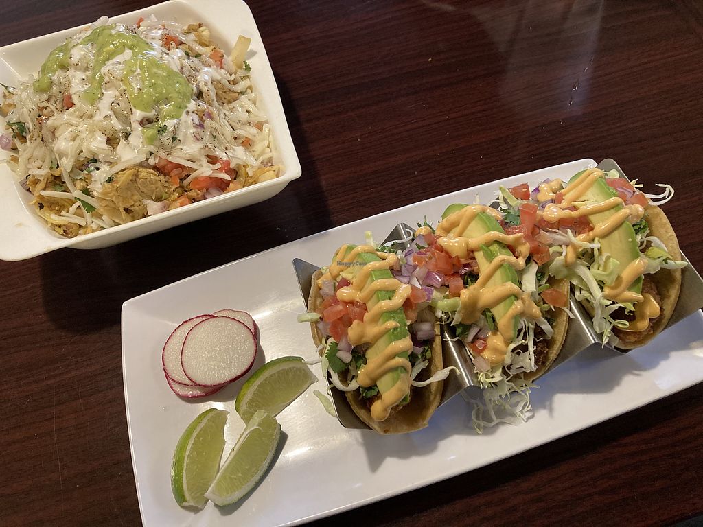 Asada Fries at top and Coconut Schrimp Tacos at bottom