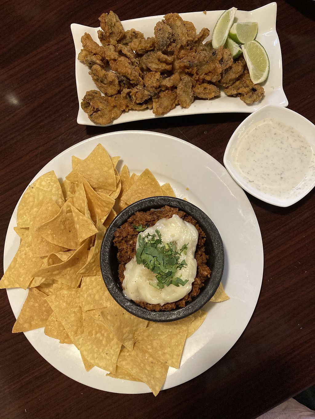 Fried Mushroom Kalamari at top and Choriqueso at bottom