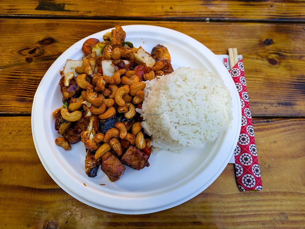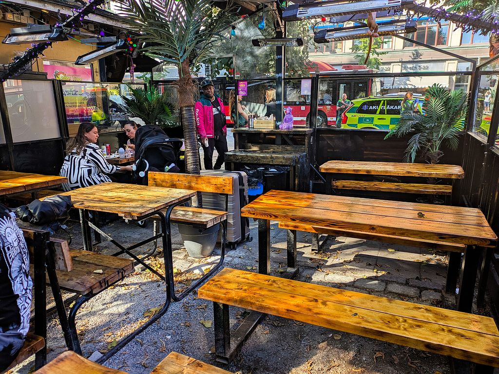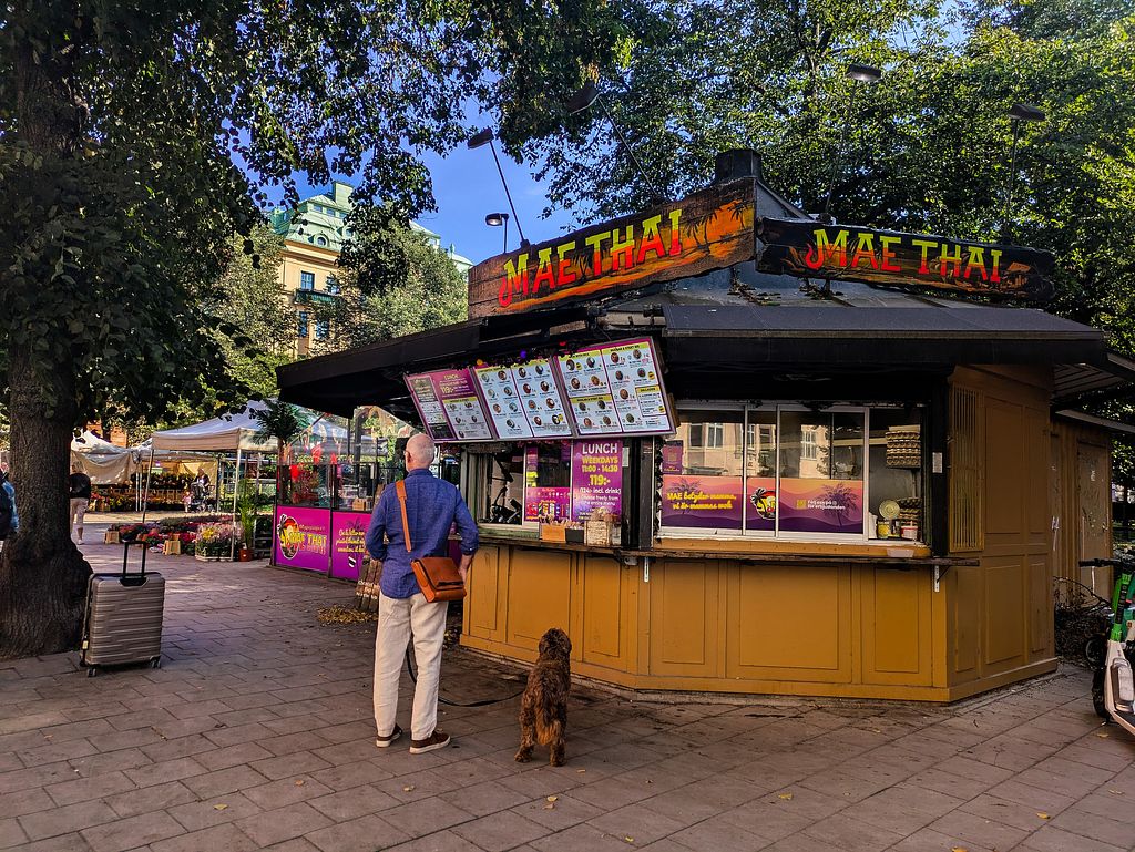 This is an outdoor kiosk, with outdoor seating at the corner of a small park -- really good for a nice day. When you order, you should ask for a vegan version of what you see on the menu. The cashew tofu I ordered was quite nice. There are 5 Mae Thai locations in Stockholm, according to Google Maps -- this is the one at Mariatorget.