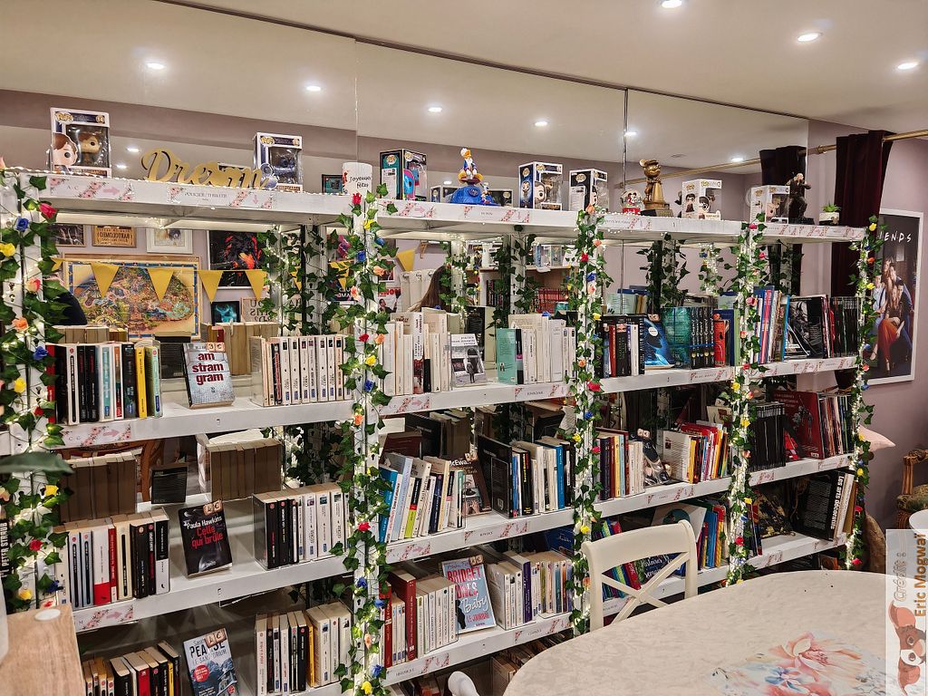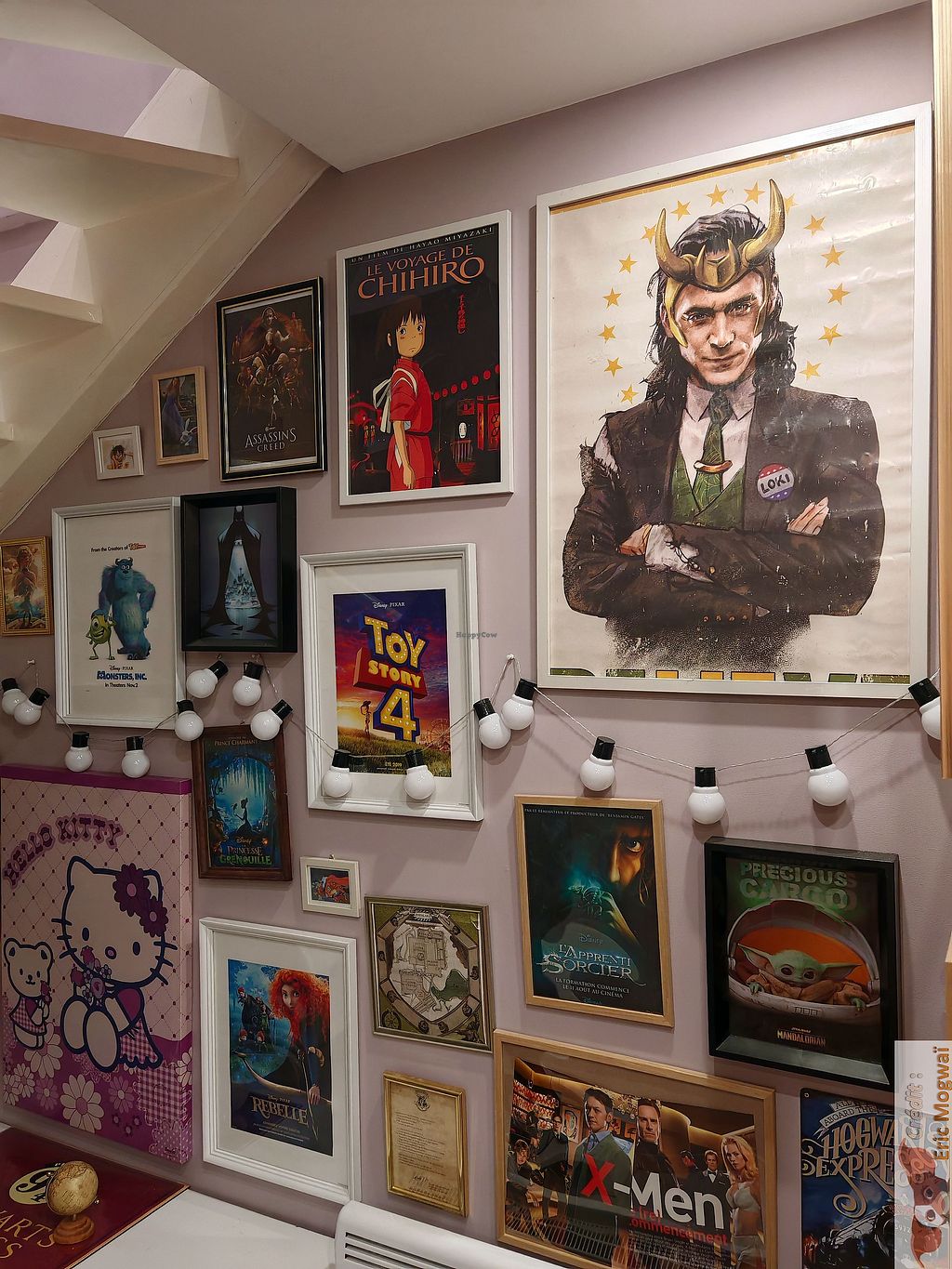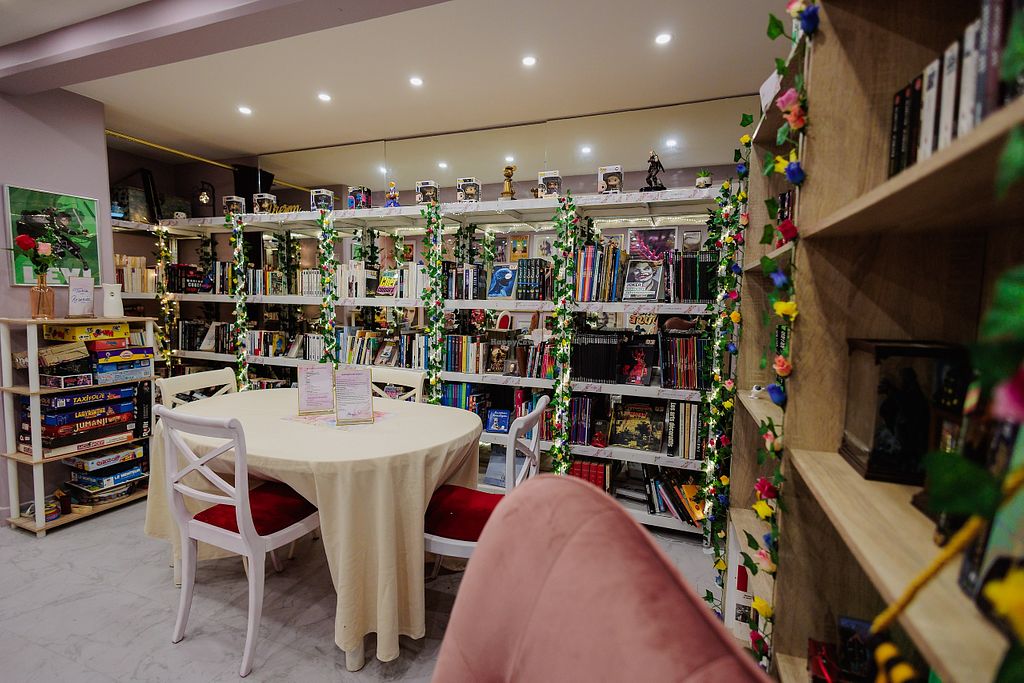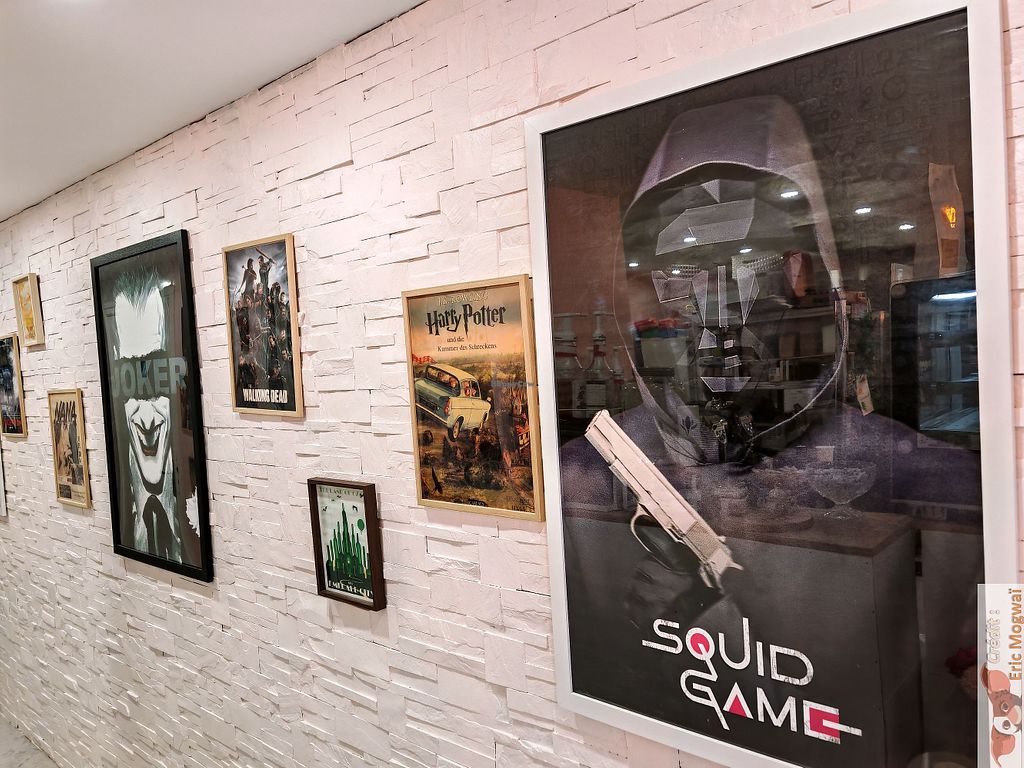 The place has a basement where you can read manga, comics, and graphic novels or play board games, with crazy decor featuring posters from various movies combined with figurines.